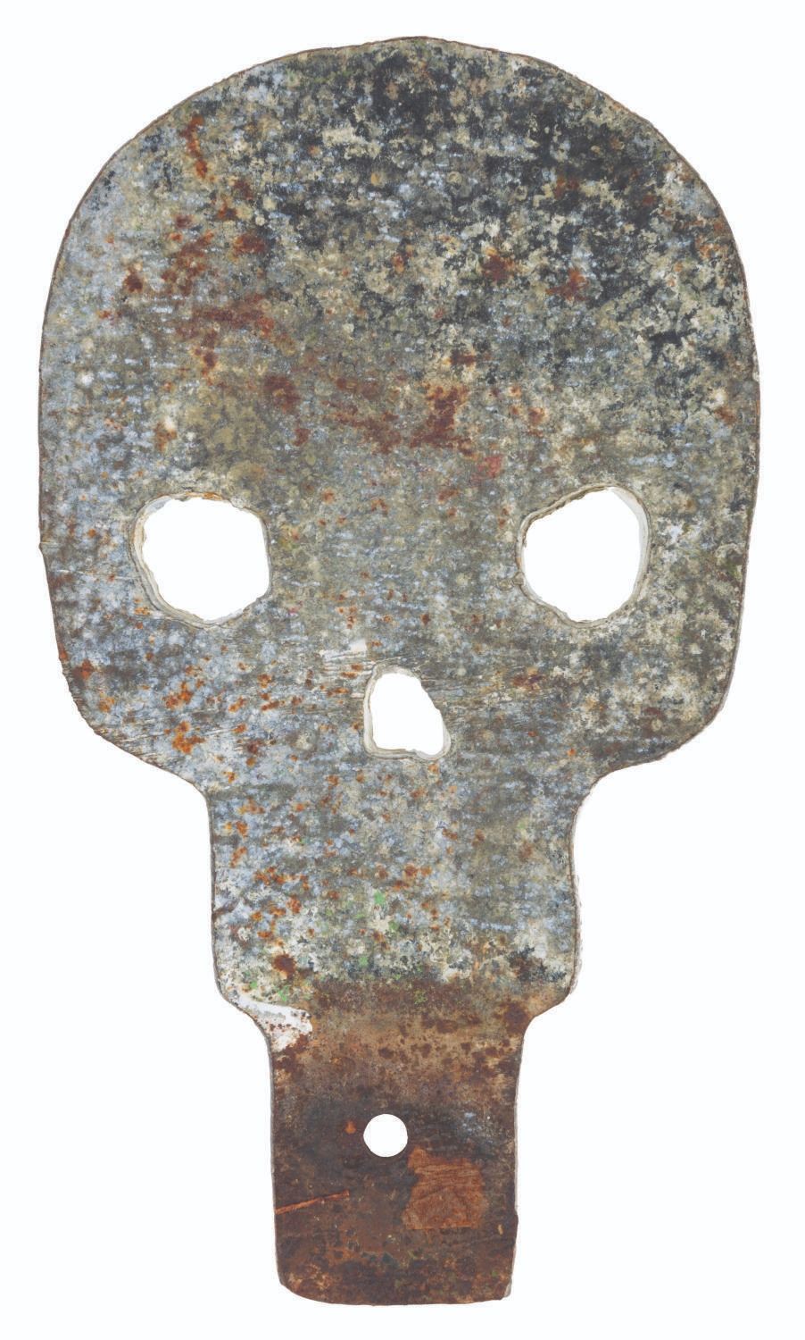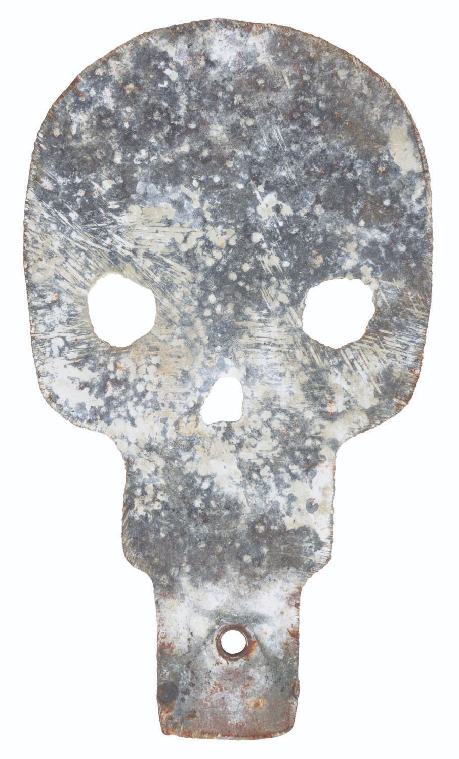 (Disneyland, 1960s-80s) An original skull target from the Big Game Safari Shooting Gallery in Adventureland. These targets had to be repainted by hand every night after getting pelted by Guests all day. Measuring 4” x 7”, the target is in good condition with heavy oxidation from age and typical stains and paint loss from Park use.