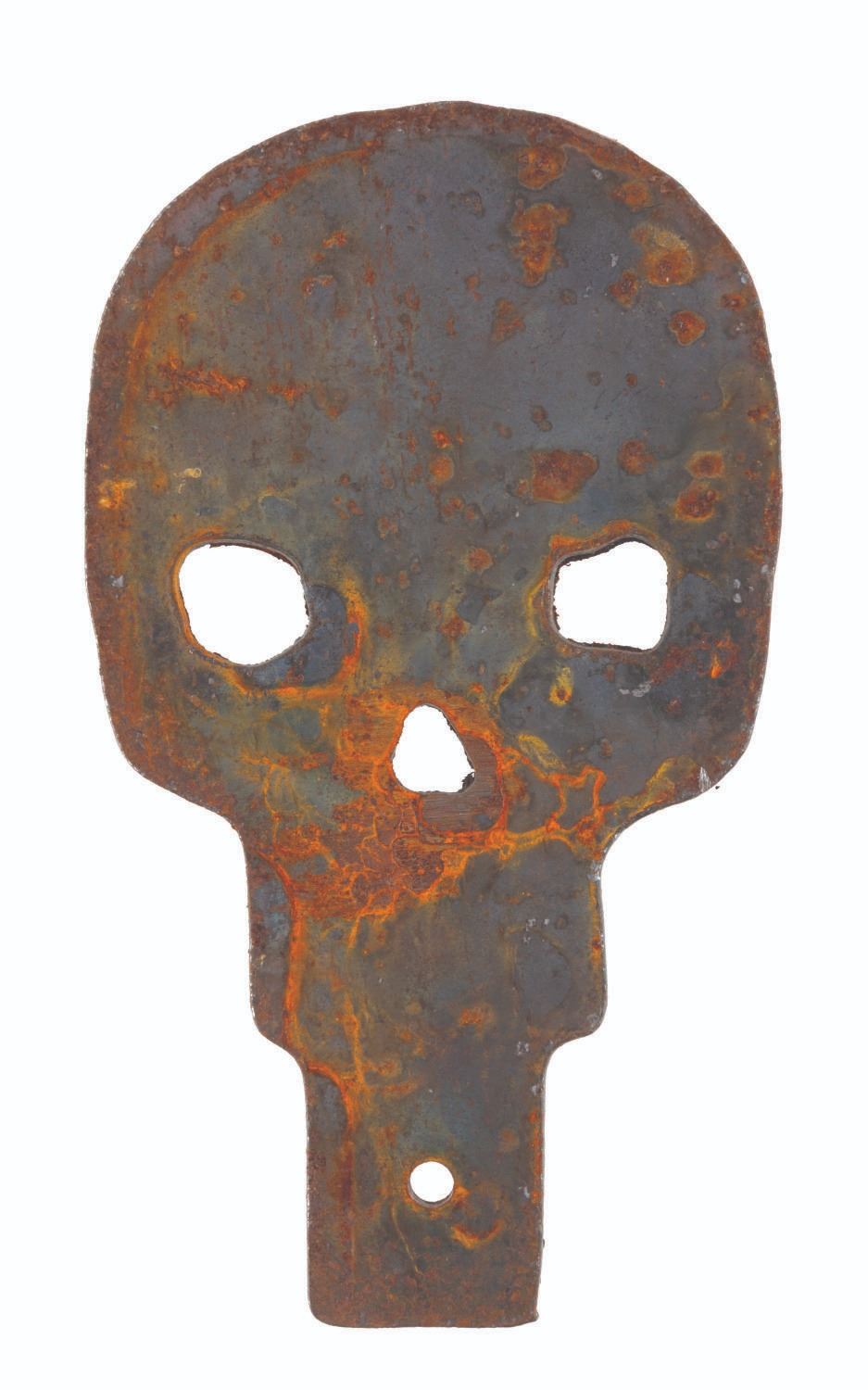 (Disneyland, 1962-82) An unpainted metal skull target from the Big Game Safari Shooting Gallery in Adventureland. Made of thick plate steel, the targets would make a satisfying"ping" when hit by the air rifle rounds. Measuring 4" x 7", the target has not seen Park use, but exhibits oxidation and rust throughout.