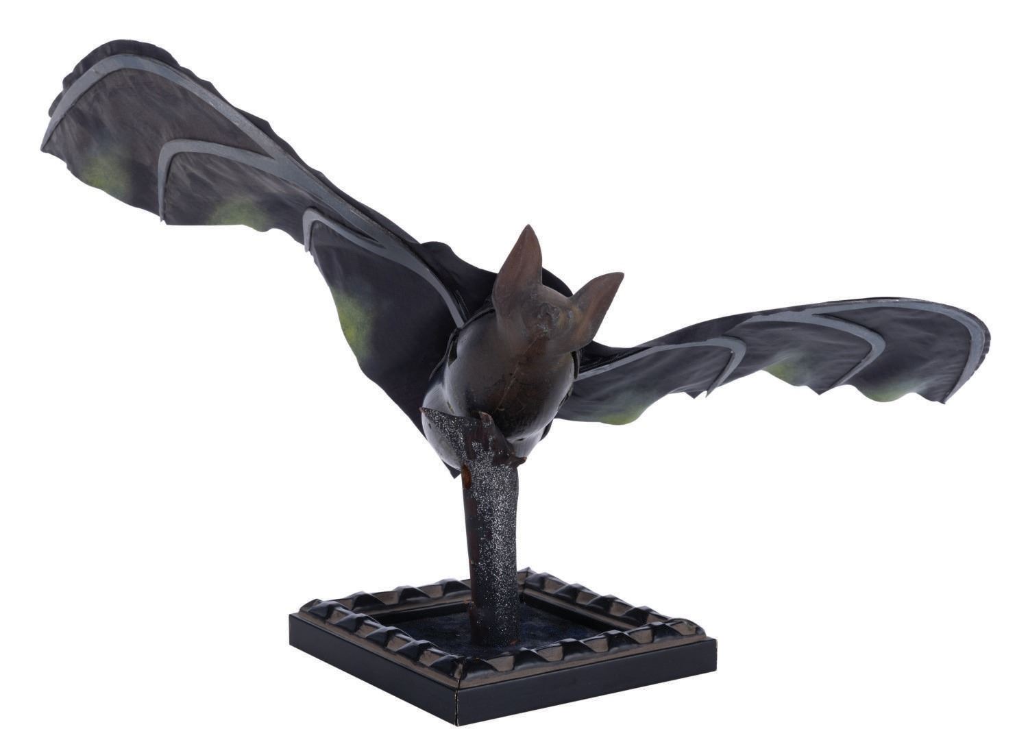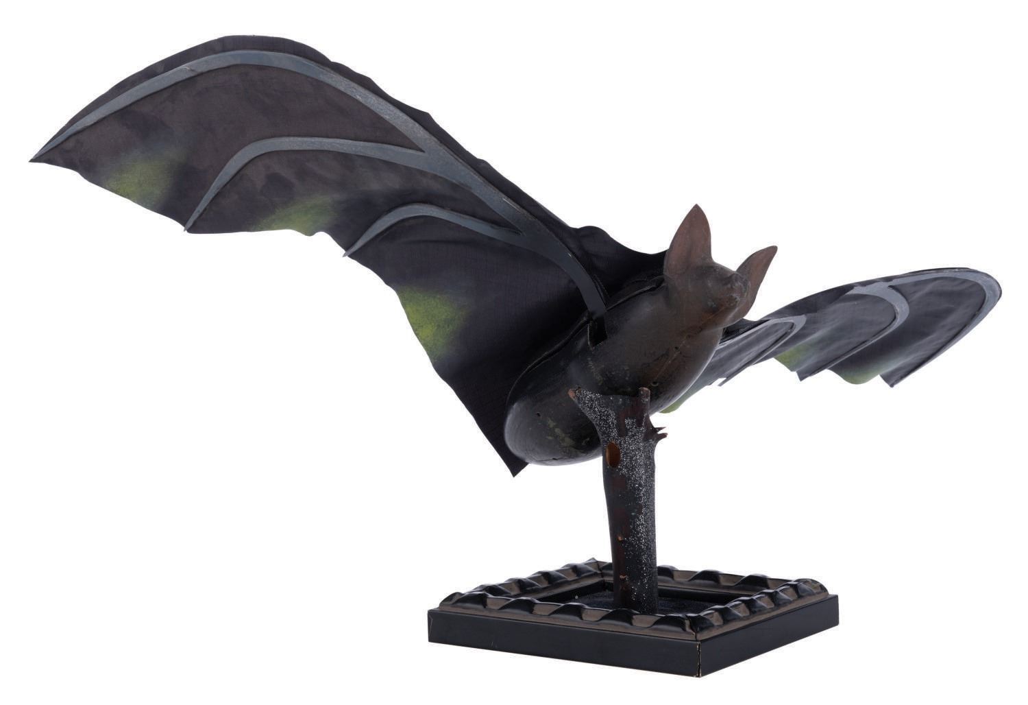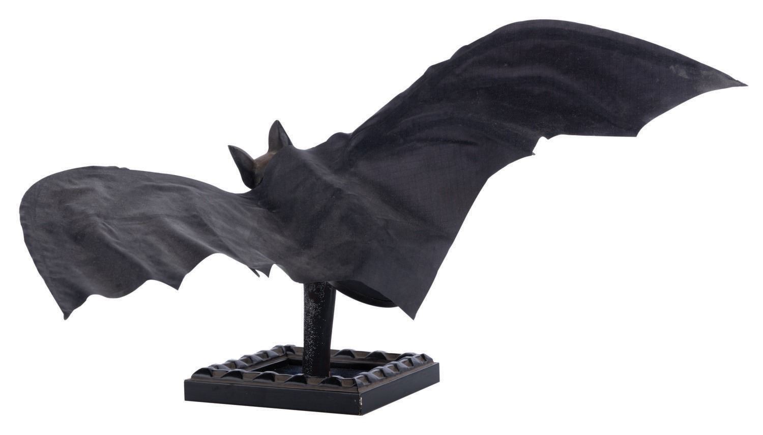 (Disneyland, 1990s) A bat prop from Big Thunder Mountain at Disneyland. Big Thunder Mountain at Disneyland received its first major rehabilitation in 1994, in honor of the attraction's 15th anniversary. This simple bat figure was prepared for the all-new show scene. Measuring 7.5" long and 19.75" from wingtip to wingtip, the figure has been mounted atop a 5.25'x5.25" wooden display base. The entire piece is in good condition with minor scuffs and wear from handling and age.