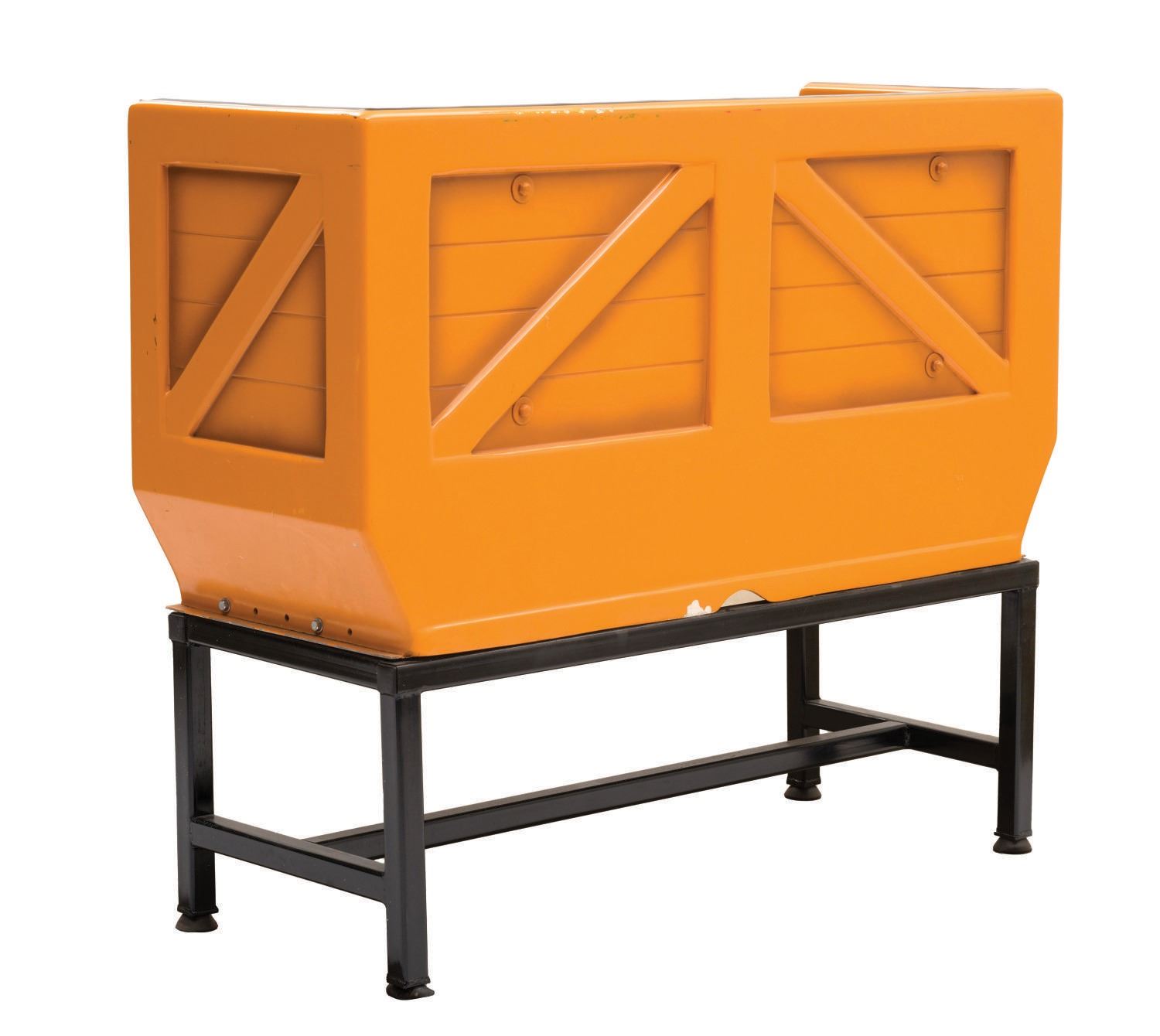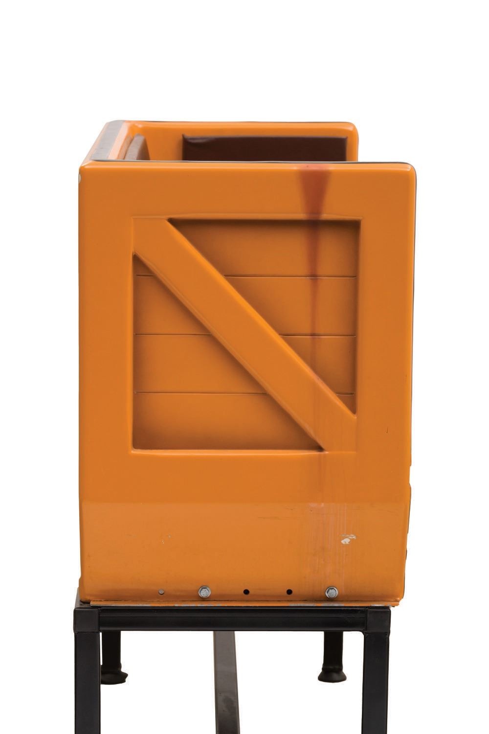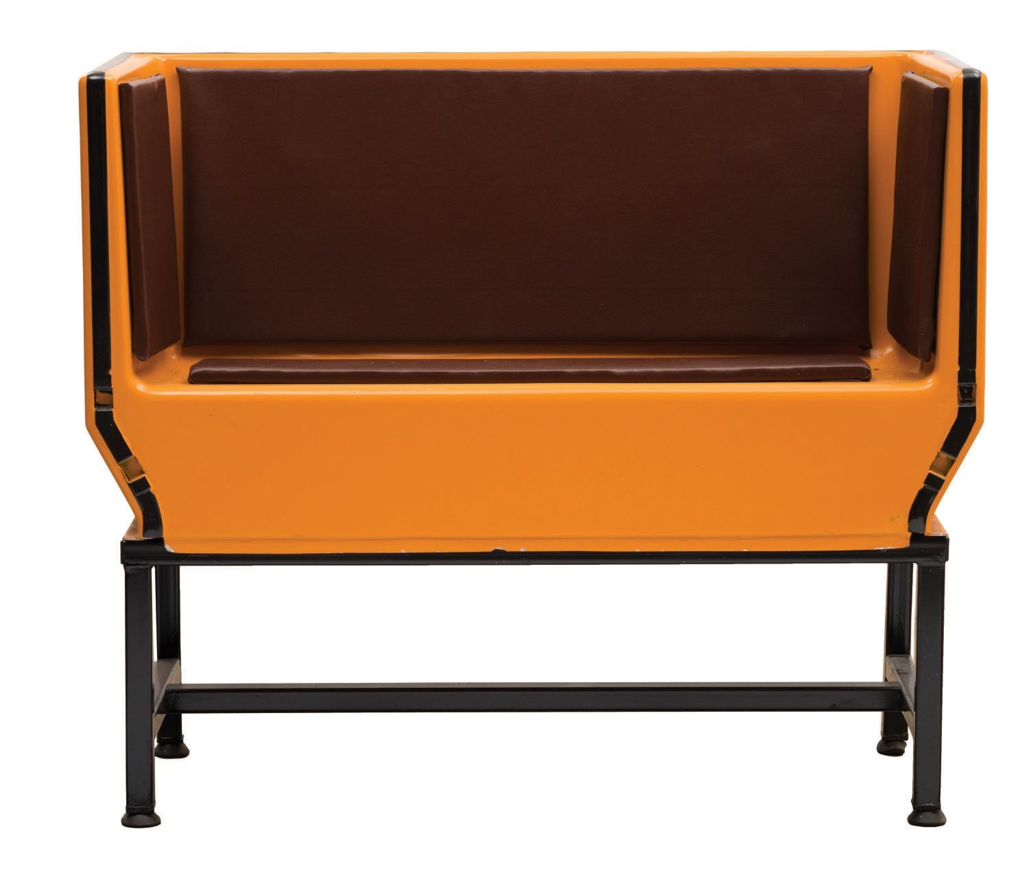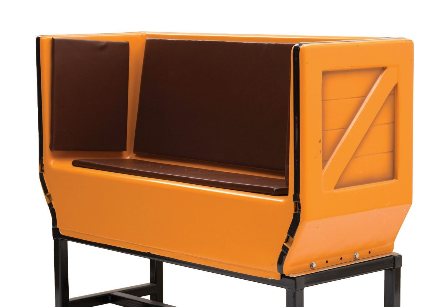 (Disneyland, 1979) A single (2) passenger seat from a Big Thunder Mountain Ride Vehicle. Each passenger car on the Big Thunder Railroad holds (3) of these seats to carry (6) passengers per car through "the wildest ride in the wilderness. The seat is in very good condition, with light wear typical of Park use. Measuring 19.25"x49.5"x27" high, the custom stand brings the full height of the piece to 44".