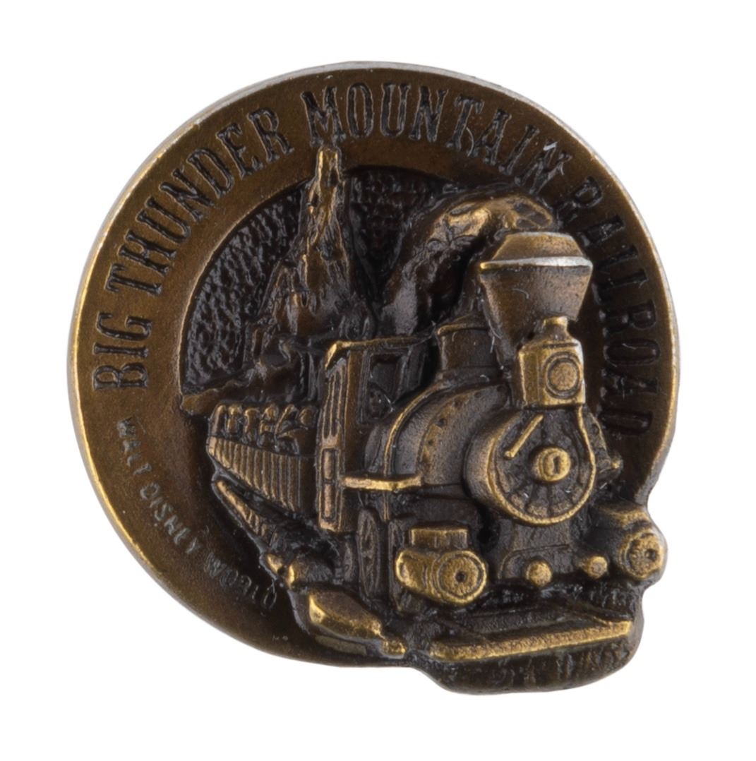 (Walt Disney World, 1980) A brass relief Big Thunder Mountain Railroad pin given to select riders on the attraction’s Grand Opening on September 23, 1980. Measuring 0.75” in diameter, the pin is in fine condition.