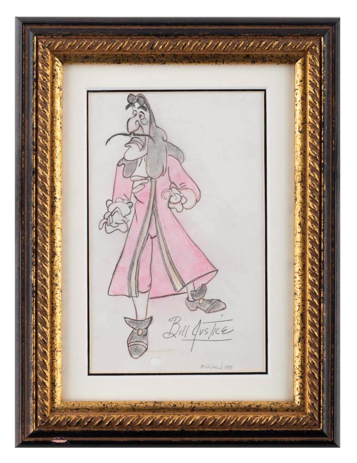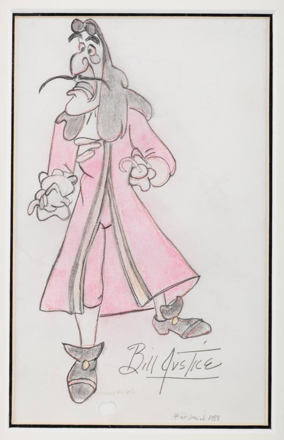 (Bill Justice, 1989) A graphite and colored pencil drawing of Captain Hook by Disney Animator, Imagineer, and Legend, Bill Justice. The Captain measures 3.75" x 7.5" on 5" x 8" animation paper in a 9.5" x 12.5" frame and is in very good condition with some soiling and smudging.