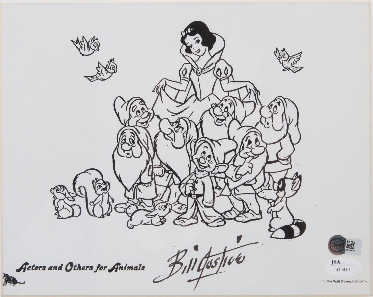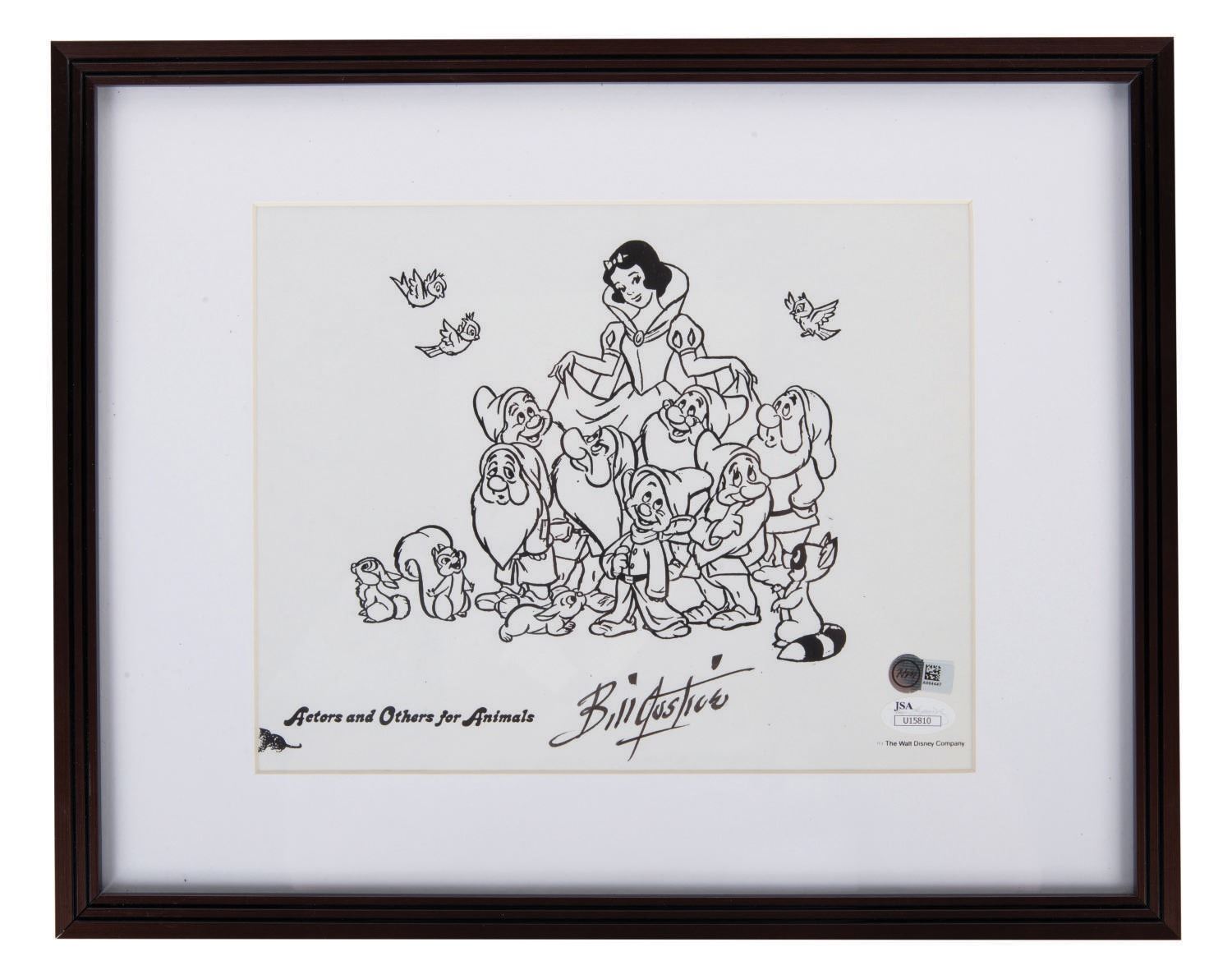 (Disney, 1970s) A print of Snow White and the Seven Dwarfs character art, signed by Bill Justice. The artwork was created and signed to support Actors and Others for Animals, a non-profit organization to promote the humane treatment of animals. The piece has a total character image size of 7"x7", while the signature measures 2"x3" within a 12"x15" frame and is in fine condition.