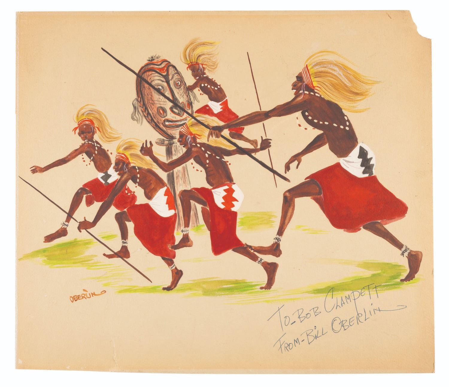 (Oberlin, 1950s–80s) An original tribal painting created by Bill Oberlin for Bob Clampett. Oberlin served as the art director on “Time for Beany” and provided voices for Clampett’s television series “Thunderbolt the Wondercolt.” Oberlin signed the piece with an inscription to Clampett in blue ink. With an image size of 9.75” x 14.5” on a 13.25” x 15.25” artist board, the mixed-media piece is in good condition with creases, edge wear, discoloration from age, and 1” x 1” of material loss at the top right corner.