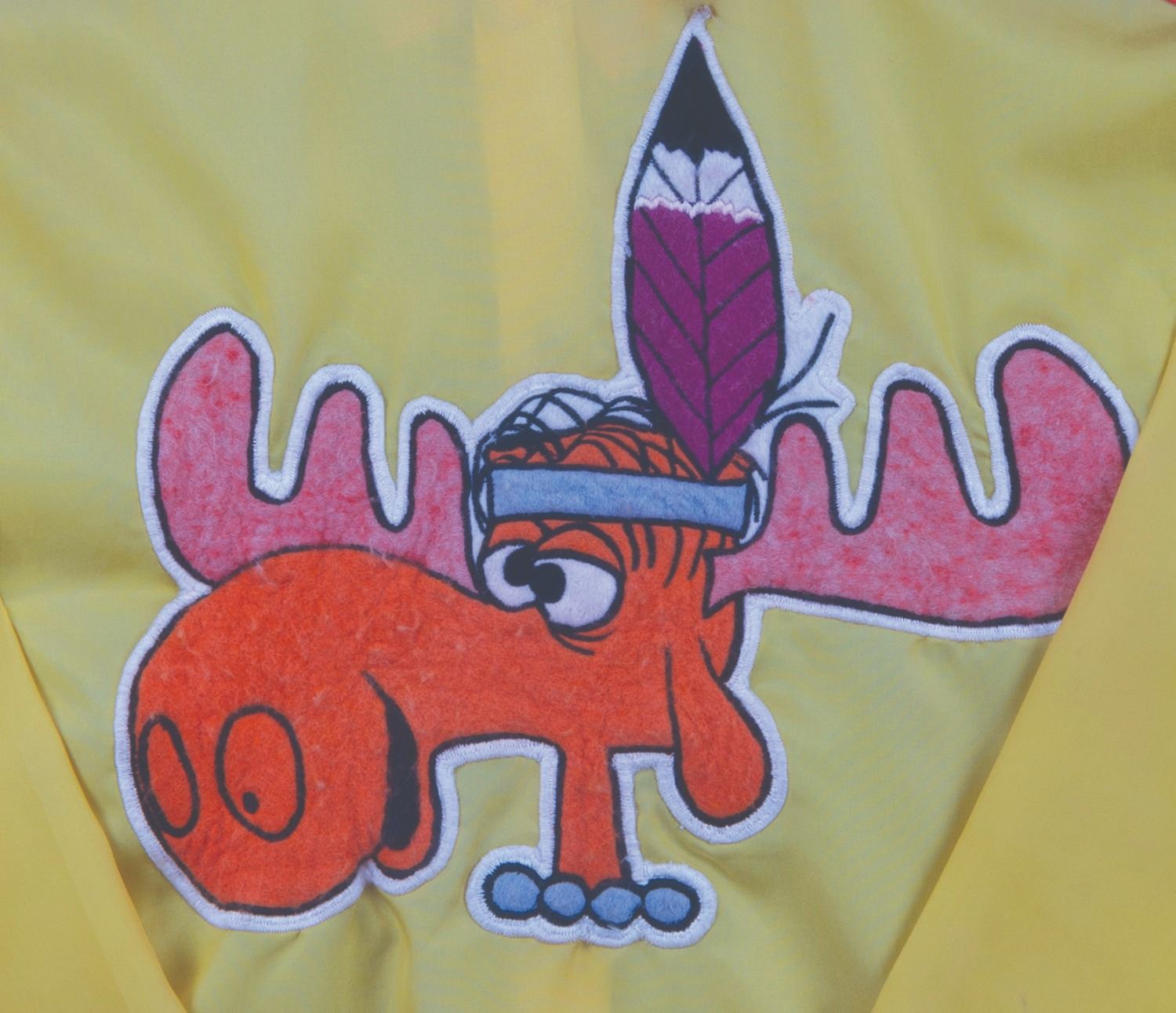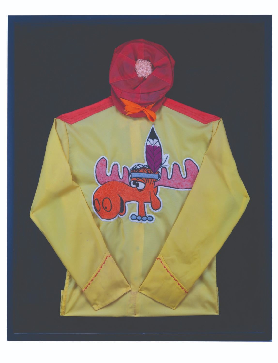 (Ward, 1960s-80s) A Chief Bullwinkle silk and cap worn by legendary jockey Bill Shoemaker. Shoemaker set the world record for the most career victories and gained such fame that Andy Warhol photographed him. The jockey also rode for Jay Ward’s personal stable, wearing this jacket in his honor. Measuring 25” x 33” in a 30.25” x 2” x 37” display, the outfit displays in very good condition with light discoloration from age and typical wear from use including stains and pilling, while the display is in good condition with scuffs, scratches, and wear.