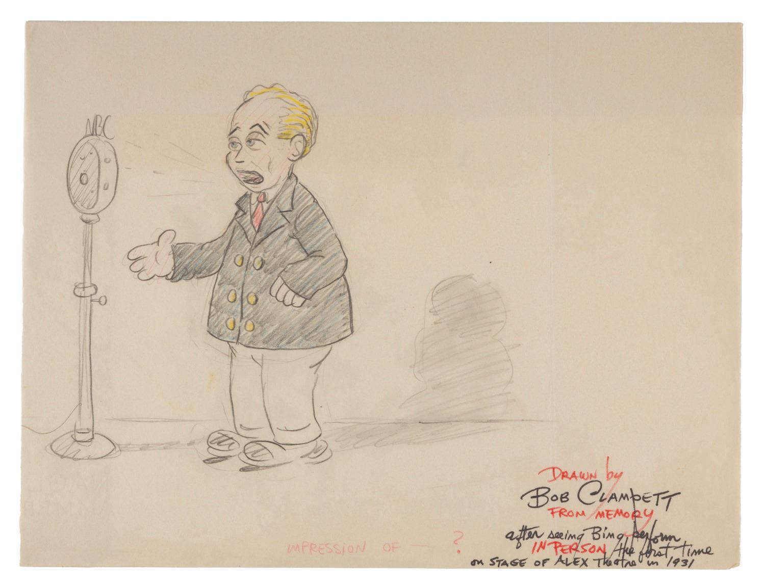 (Clampett, 1931) A drawing of Bing Crosby by Bob Clampett. Clampett signed the piece and noted it was “Drawn from memory after seeing Bing perform in person the first time on stage of Alex Theatre in 1931.” Accomplished in graphite and color pencils, the drawing with an image size of 5.75” x 7” on animation paper folded to 8” x 10.5” is in good condition with light wear from handling and age.