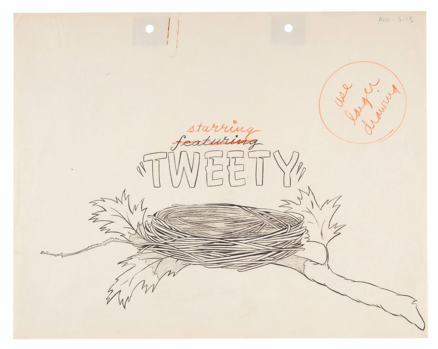 (Schlesinger, 1944) An original title card concept drawing for the Merrie Melodies short “Birdy and the Beast,” directed by Bob Clampett. Accomplished in graphite, ink, and colored pencil, with a character image size of 6” x 11.25” on 9.5” x 12” animation paper, the drawing is in good condition with light edge wear and creasing from production use, a paperclip oxidization stain, and light discoloration from age.