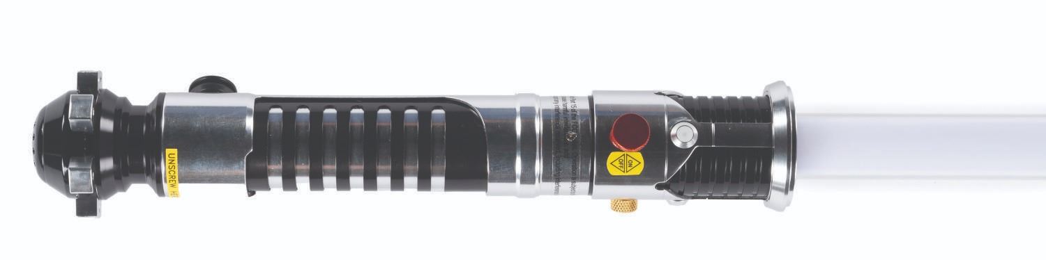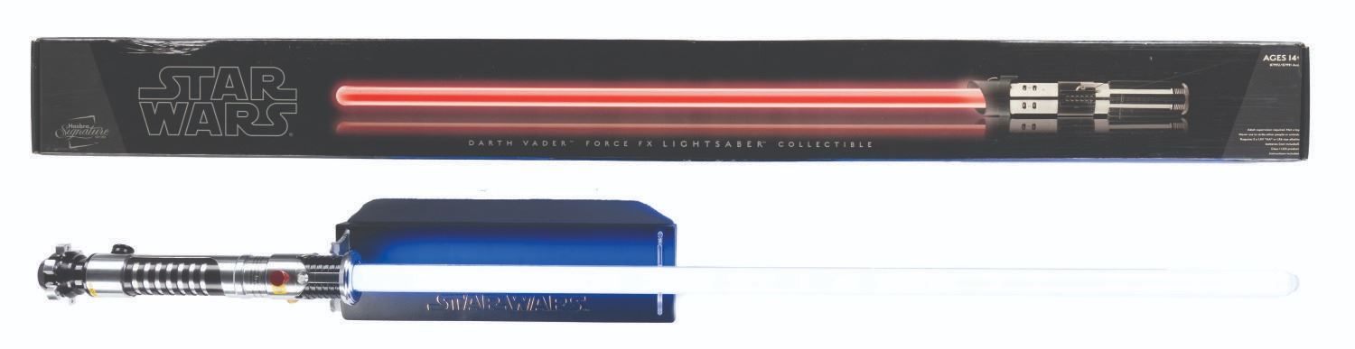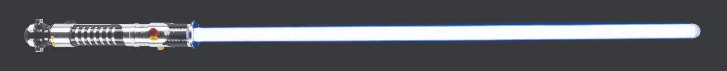 (Hasbro, 2019) A Star Wars: The Black Series Obi-Wan Kenobi Force FX lightsaber. This lightsaber, which glows light blue and features a spiky metal base, is a replica of the one Obi-Wan wields in “Star Wars: Episode 1 - The Phantom Menace.” The lightsaber includes a display stand and requires three AAA batteries (not included). Measuring 43.75” and housed in a non-matching 4” x 44.75” Darth Vader Signature Series lightsaber box, the tested lightsaber is in very good working condition with light scratches.