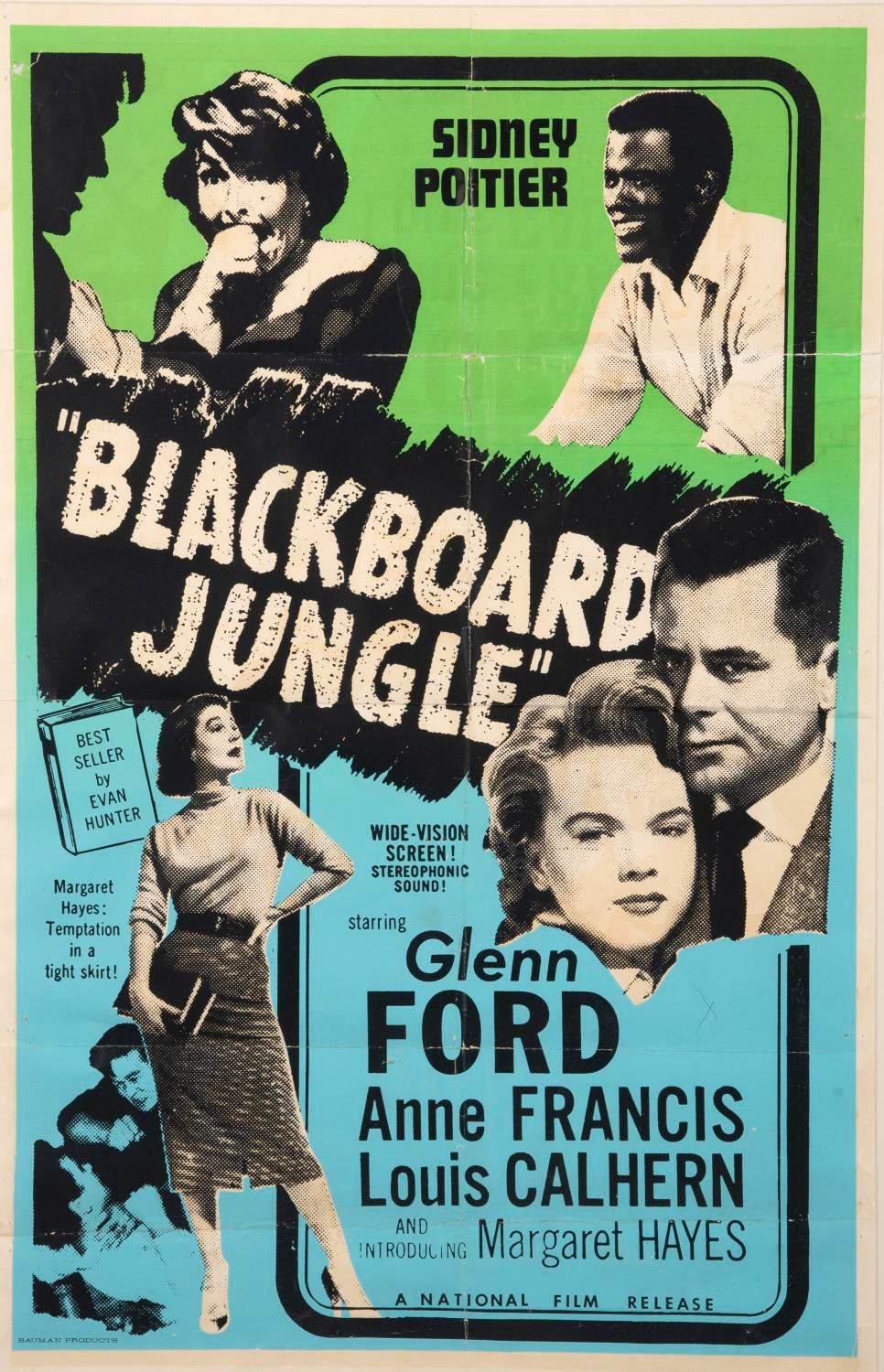 (National Film, 1960s) A one sheet poster for the Canadian rerelease of Blackboard Jungle. Notably, this poster gives top billing to Sidney Poitier, who was fairly unknown when the film debuted in 1955. Measuring 22"x34", the poster displays in good condition, with creases from original folds, and wear including pinholes and tears from display.