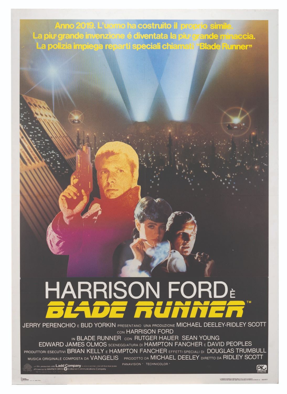 (Warner Bros., 1982) An Italian due foglio (two-sheet) movie poster for Ridley Scott's brilliant neo-noir "Blade Runner." Measuring 38.5" x 54", the poster is mounted to foamcore and in good condition with light soiling, edge wear, discoloration, and heavy wear to the foamcore backing, including dents, bends, creases, and tears.