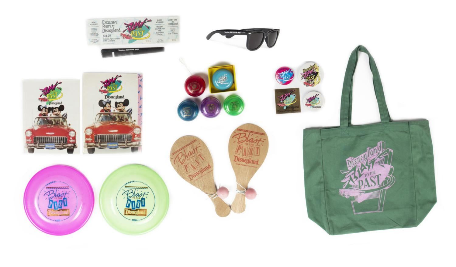 (Disneyland, 1989) A collection of eighteen Blast from the Past souvenirs and press materials. Disneyland's Blast from the Past events were a celebration of the 1950s with themed attire, hula hoops, special parades, and unique souvenirs. Included are two Frisbees, two paddle ball toys, five yo-yos with one in its original box, a tote bag, a press packet, three buttons, a comb, sunglasses, an unused commemorative passport, and a metal "Blast from the Past - Dream Machine Showcase" plaque. The souvenirs measure 2.25" x 2.25" to 15" x 22" and are in good condition overall, with some wear from use; the comb is missing a few teeth, the bag has soiling, and one of the paddle toys has a broken string.