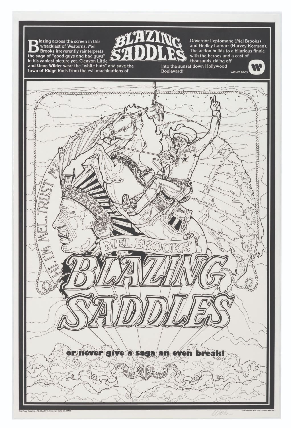 (The Paper Pros Inc., 1974) A large laminated coloring poster for Mel Brooks' comedy classic "Blazing Saddles." The Hollywood Movie Doodles poster is signed by designer Bill Wallen in pencil at the lower right. Measuring 23.25" x 35.25", the laminated poster is in very good condition with light scratches and wear.