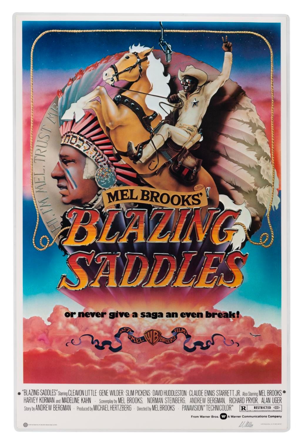 (The Poster Pros, 1976) A merchandise poster of the "Blazing Saddles" one-sheet. This poster was laminated to keep as a sample. Measuring 23.25" x 35.25", the laminated poster displays in very good condition with light handling wear, and an approval signature in the bottom border.