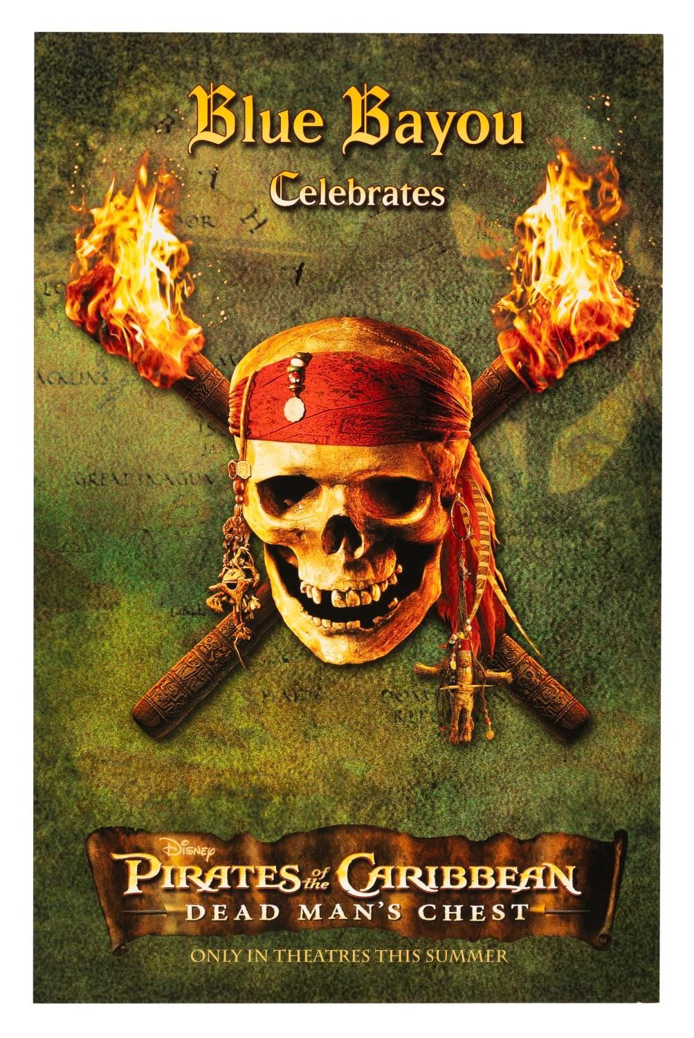(Disneyland, 2003-2007) A collection of six specialty menus from the Blue Bayou Restaurant in New Orleans Square, themed to Disney theatrical releases. Included are one menu for "The Haunted Mansion," two duplicates for "Pirates of the Caribbean: The Curse of the Black Pearl," one for "Pirates of the Caribbean: Dead Man’s Chest," one for "Pirates of the Caribbean: At World’s End," and one themed to Tesoro Island from the attraction. Ranging in size from the 8.25" x 13.75" "Haunted Mansion" to the 11" x 17" Tesoro Island menu, the souvenirs display in fair to very good condition with edge wear, scratches, and heavy creases and paper loss to the "Haunted Mansion" menu.