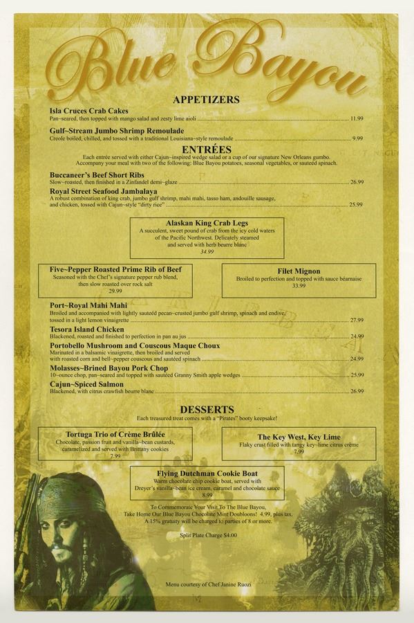 (Disneyland, 2006) A Blue Bayou Restaurant Menu promoting “Pirates of the Caribbean: Dead Man’s Chest” with dining options inspired by the film. Measuring 17” x 11”, the menu is in very good condition with light edge wear from use.