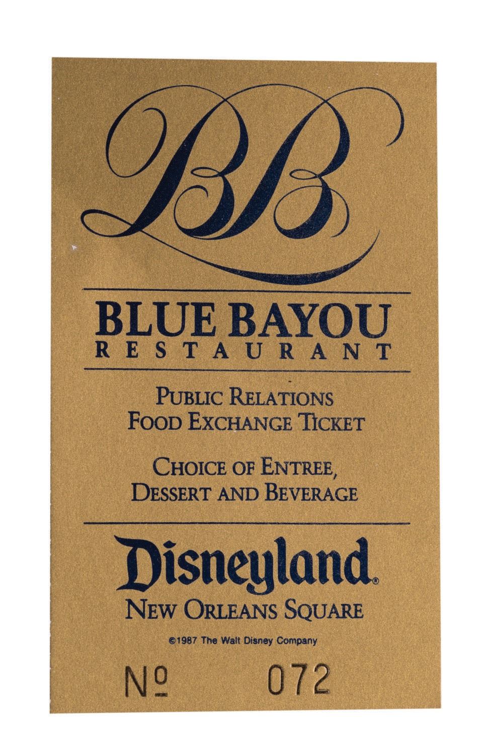 (Disneyland, 1987) A Public Relations Food Exchange Ticket for the Blue Bayou Restaurant given to VIP guests. Dated 1987, the ticket entitled the bearer to a choice of entree, dessert, and beverage. The metallic gold card features the Blue Bayou Restaurant logo and is stamped with the number "072." Measuring 3.75"x2.25", the piece is in very good condition with minimal wear.