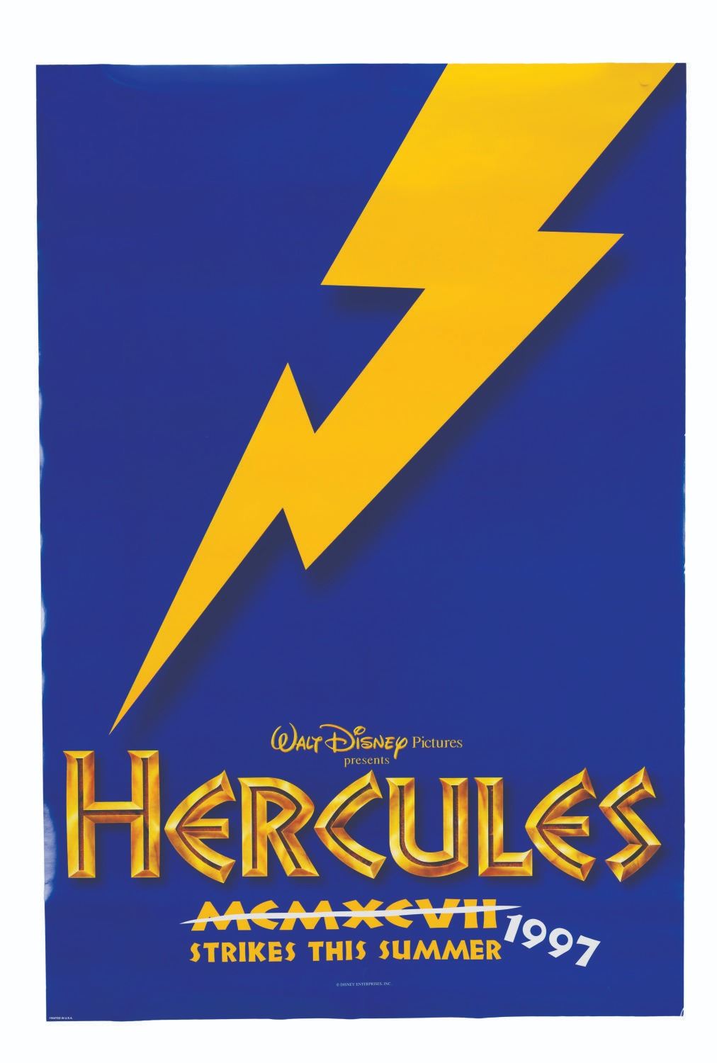 (Disney, 1997) A one-sheet for the theatrical release of "Hercules, " with Roman numerals crossed out and replaced by 1997. This blue version was one of four colors released of this style of poster. Measuring 27 " x 40 ", the poster is in very good condition with very light handling wear and pinpoint creases at center bottom from a rubber band.