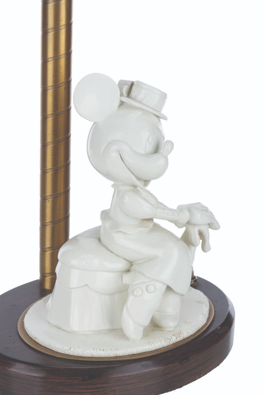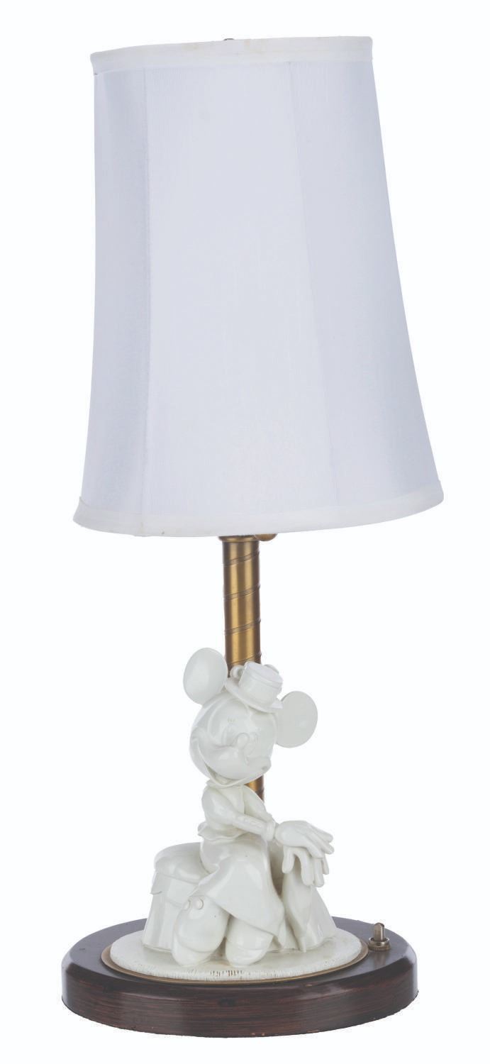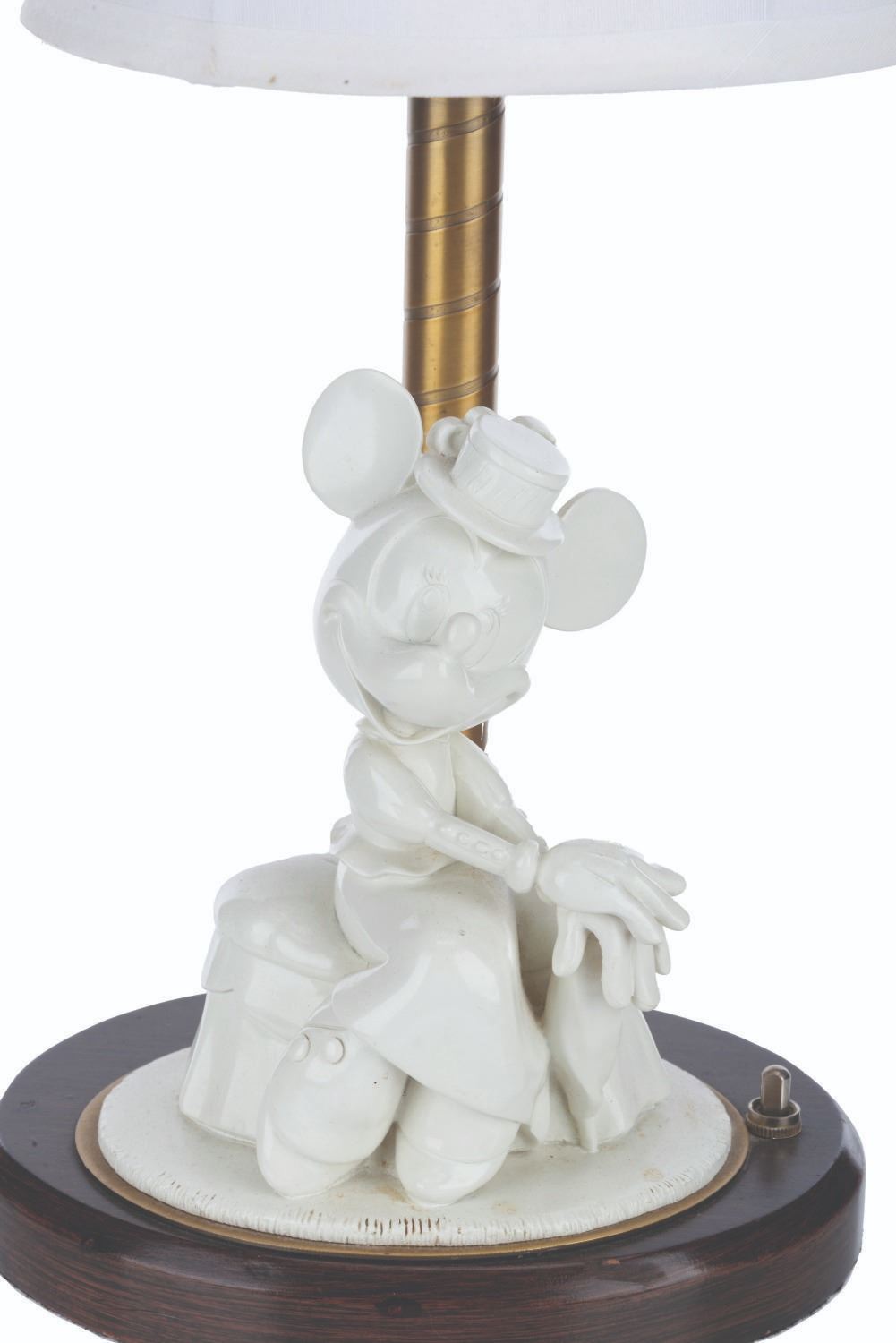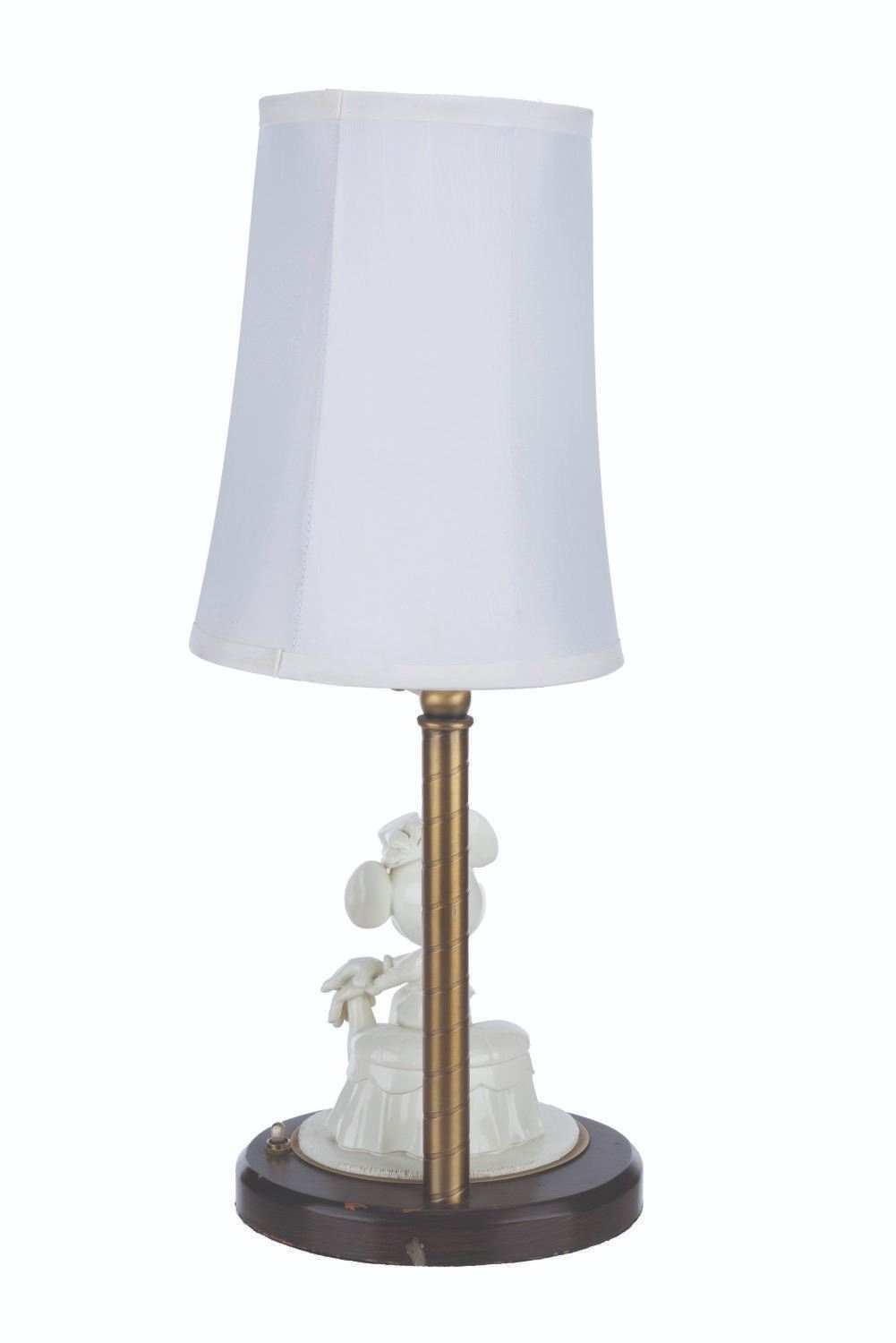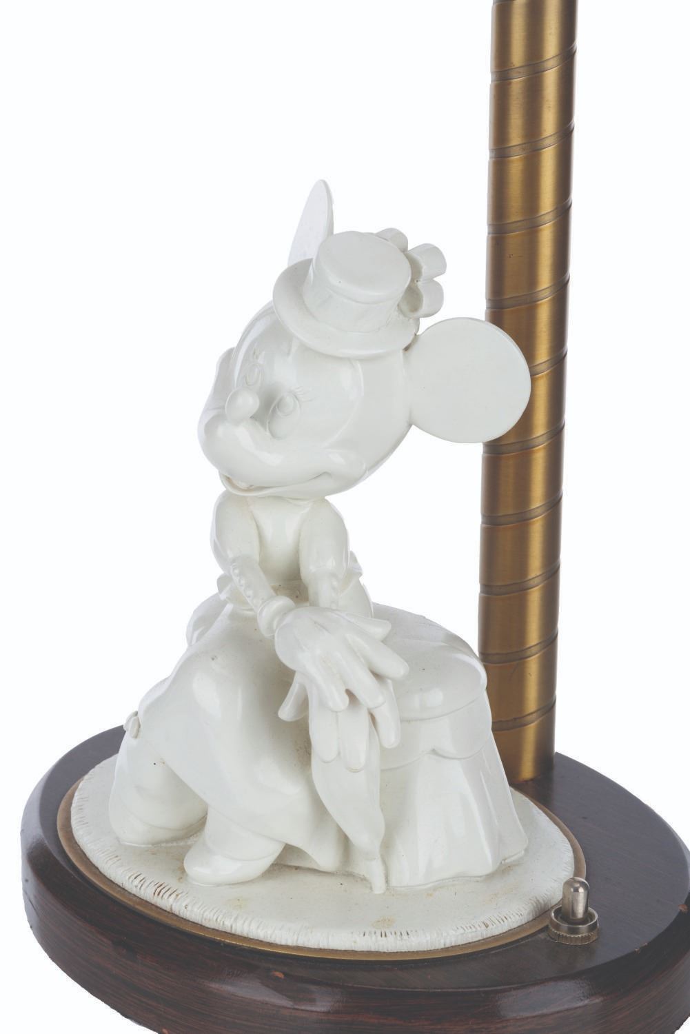 (Disney’s BoardWalk Resort, 1990s-2000s) A lamp featuring Minnie Mouse in early 20th-century attire. This style of lamp was displayed in guest rooms at Disney’s BoardWalk Resort at Walt Disney World. Measuring 6.25” x 8” x 20.75” tall, the lamp is in good condition with typical wear, scuffs, and stains from Resort use.