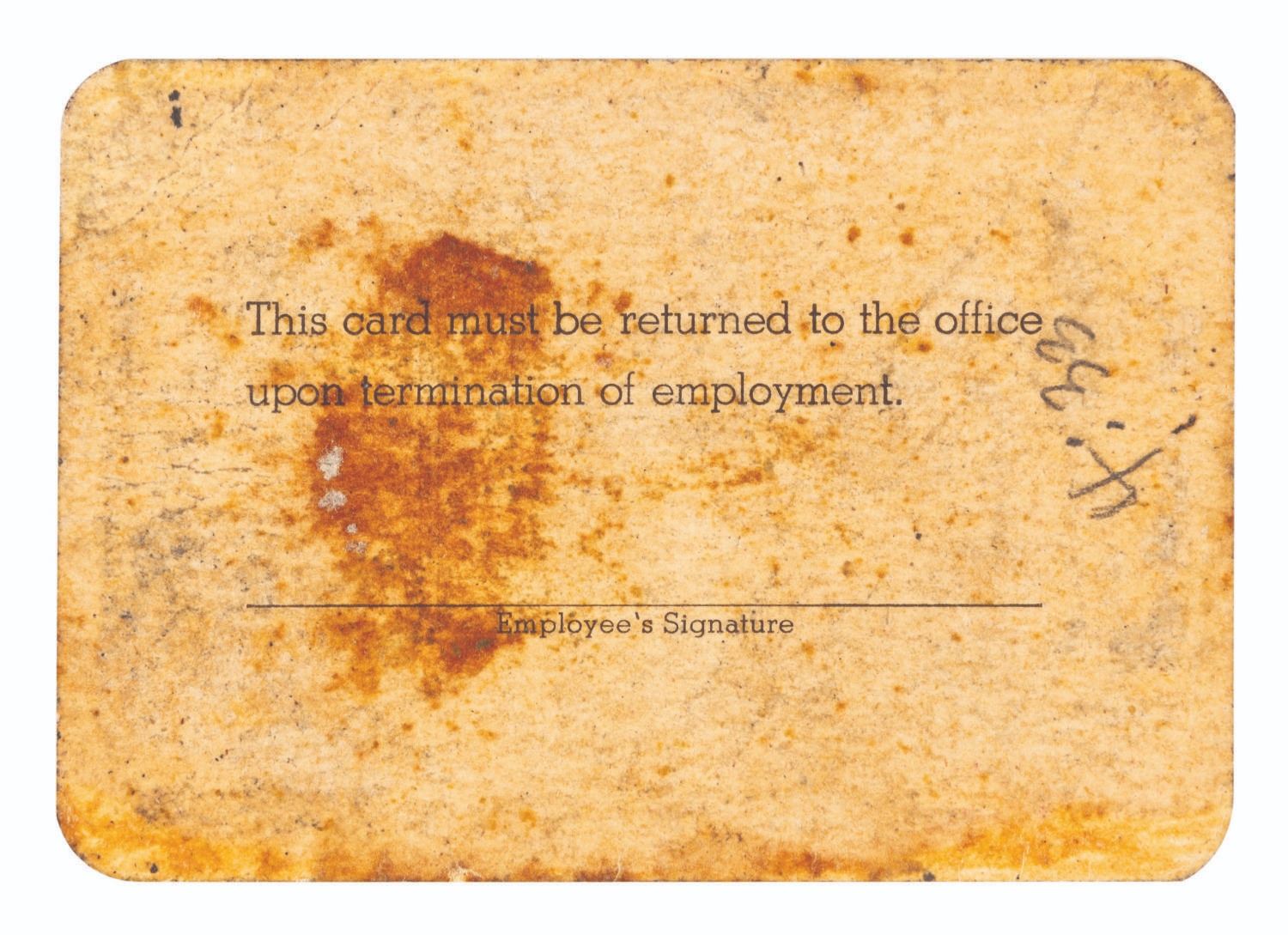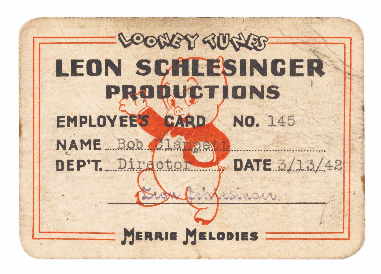 (Schlesinger, 1942) A Bob Clampett employee card for Leon Schlesinger Productions, dated March 13, 1942. This was a significant year for Clampett, as he directed classic films such as “A Tale of Two Kitties,” “Bugs Bunny Gets the Boid,” and “Horton Hatches the Egg.” The latter was the very first animated adaptation of a Dr. Seuss story. Measuring 2.75” x 3.75”, the card is in good condition with creases, wear, discoloration from age, and stains, particularly to the reverse.