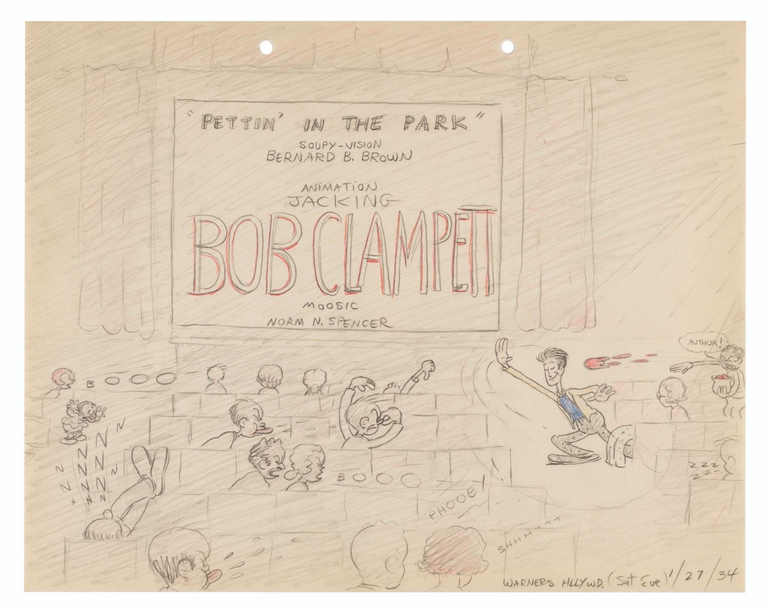 (Clampett, 1934) A drawn diary sketch by Bob Clampett. Dated January 27, 1934, Clampett depicts himself taking bows for the audience (while they boo him and throw tomatoes at him) at the Warners Hollywood Theater as his credit for “Pettin’ In The Park” appears on screen (filling half the screen). With an image filling the full 9.5” x 12” animation paper, the drawing accomplished in graphite and colored pencils is in fine condition, with expected light color shift to the paper from age.