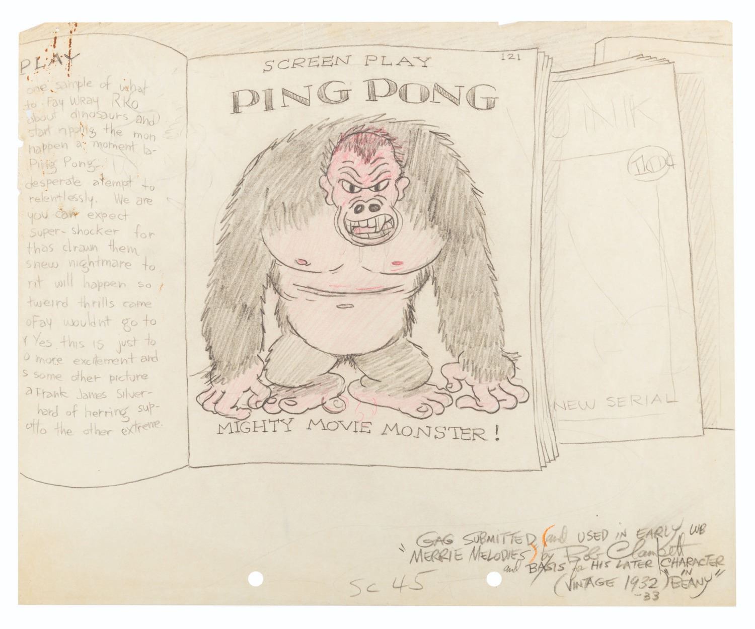 (Warner Bros., 1933) A signed gag drawing submitted by Bob Clampett and used for the Merries Melodies short “I Like Mountain Music,” directed by Rudolf Ising. The gorilla character “Ping Pong” is a parody of “King Kong,” which had premiered in theaters just two months prior. Pop-culture puns such as this became a hallmark of Bob Clampett’s humor throughout his career. Clampett signed the drawing at the bottom right with a note explaining the drawing's history. Accomplished in graphite and colored pencil and measuring 9.75” x 12”, the drawing is in good condition with light edge wear and tear from production use.