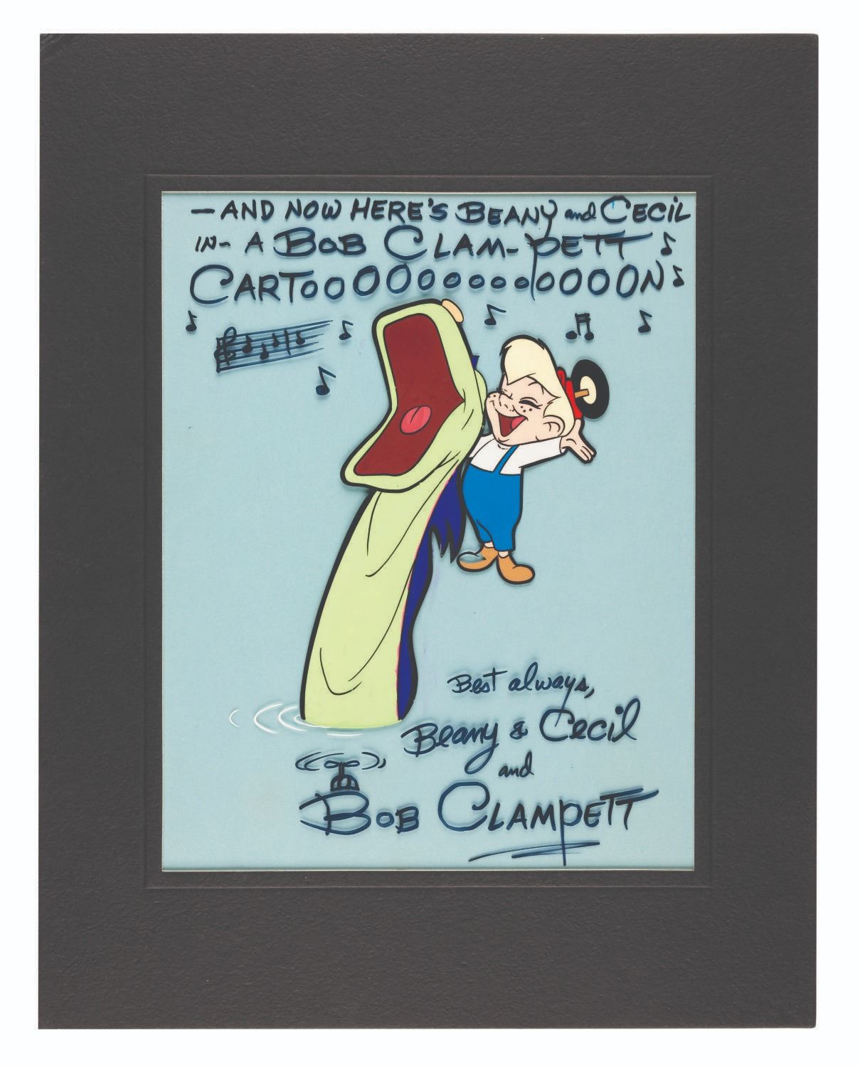 (Clampett, 1962) An original hand-painted production cel from “Beany and Cecil” signed by Bob Clampett. With a character image size of 6” x 4” on a 9.5” x 7.5” visible cel in a 14” x 11” matte, the cel displays in good condition with light line loss, a 0.5” area of paint loss on Beany’s right shoe, and light warping from age.