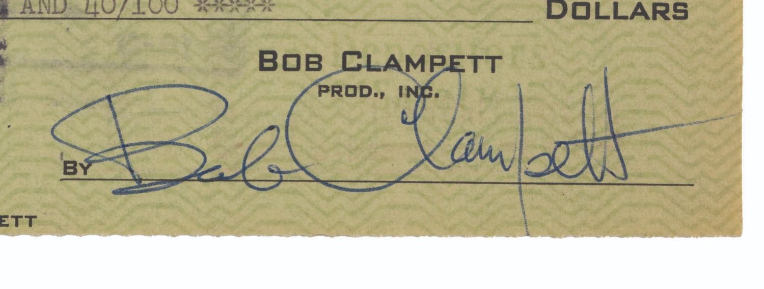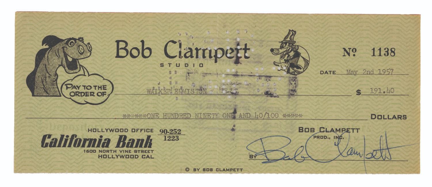 (Clampett, 1957) A Bob Clampett Studio check signed by Clampett and made out to voice actor Walker Edmiston. Known for his work on “Time for Beany,” “Thunderbolt The Wondercolt,” “H.R. Pufnstuf,” and “The Walker Edmiston Show,” Edmiston signed the reverse of the check in blue ink. Measuring 3.5” x 8.5”, the check displays in very good condition with discoloration from age, edge wear, smudges, a full vertical fold at the center, and punctures from bank use.