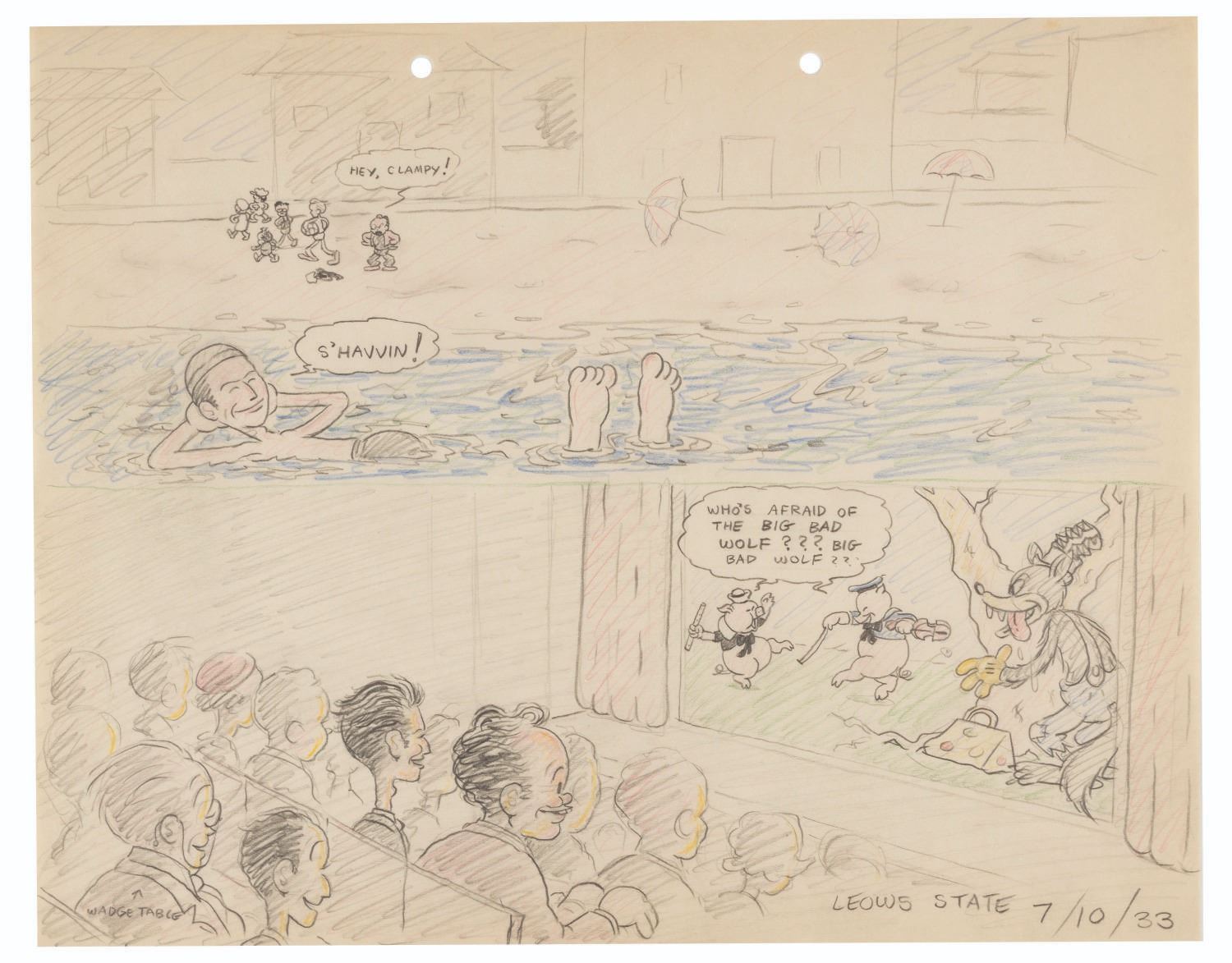 (Clampett, 1933) An original drawing from Bob Clampett's drawn diary featuring a day at the beach and an evening with friends and colleagues at a screening of Walt Disney's "Three Little Pigs" at Loew's State Theater in downtown Los Angeles. The graphite and colored pencil drawing, dated July 10, 1933, measures 9.5” x 12” and is in fine condition, showing light discoloration due to age.