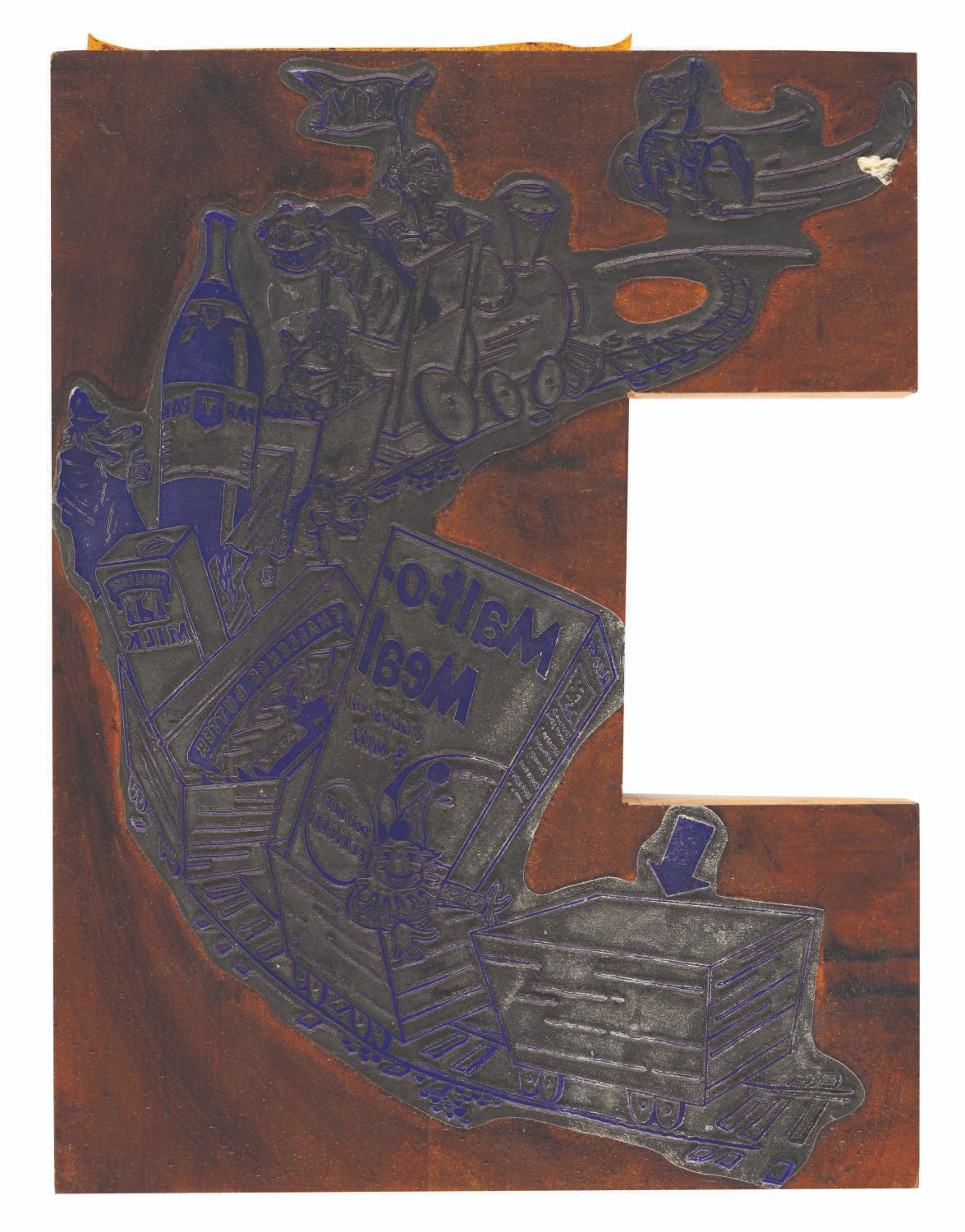 (Clampett, 1950s-60s) A large printing block featuring Bob Clampett’s characters Beany, Cecil, Thunderbolt the Wondercolt, Willy the Wolf, Clowny, and Captain Huffenpuff, on a train with sponsor products from Challenge Dairy, Nehi, and Malt-O-Meal. Measuring 7” x 9.25”, the block is in very good condition with scratches, scuffs, labeling tape and wear from use.