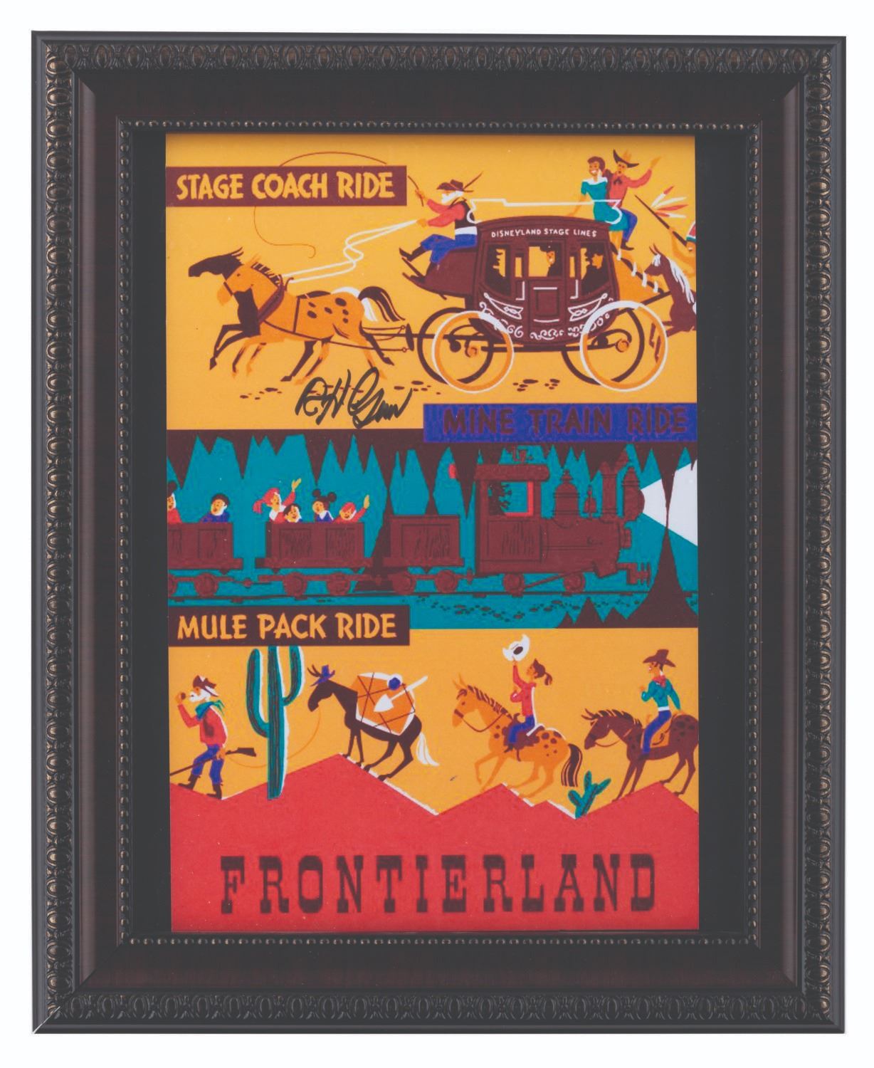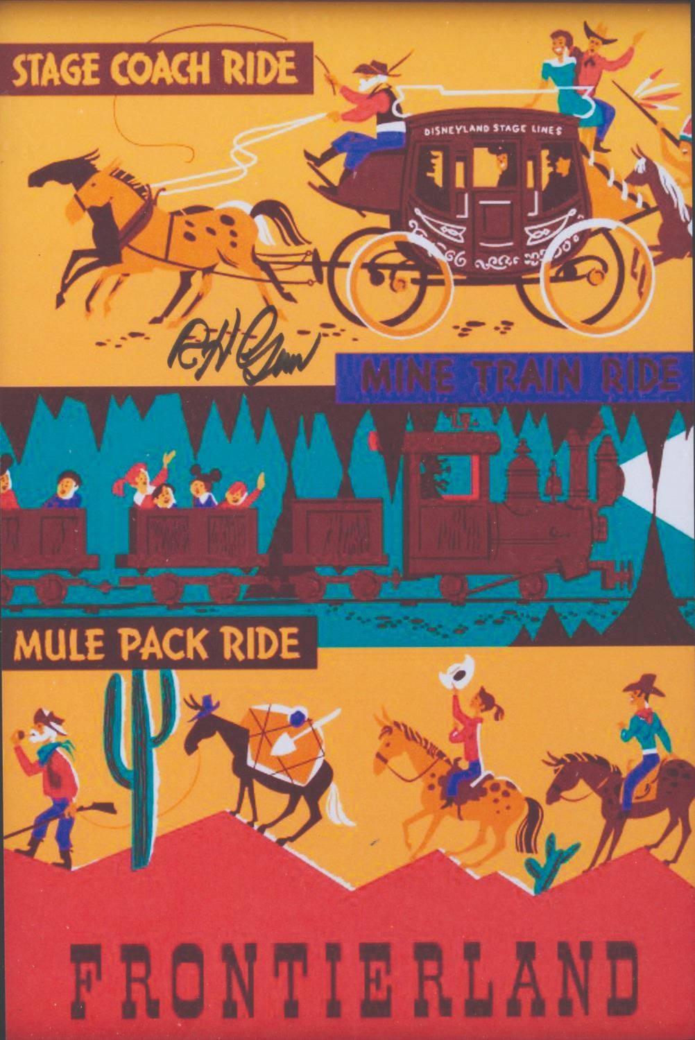 (Disneyland, 2000s) A small, low-resolution fan-made print of a Frontierland attraction poster signed by Disney Legend Bob Gurr. Measuring 7" x 10.75" on an 8.5" x 11" card, the print is in fine condition.