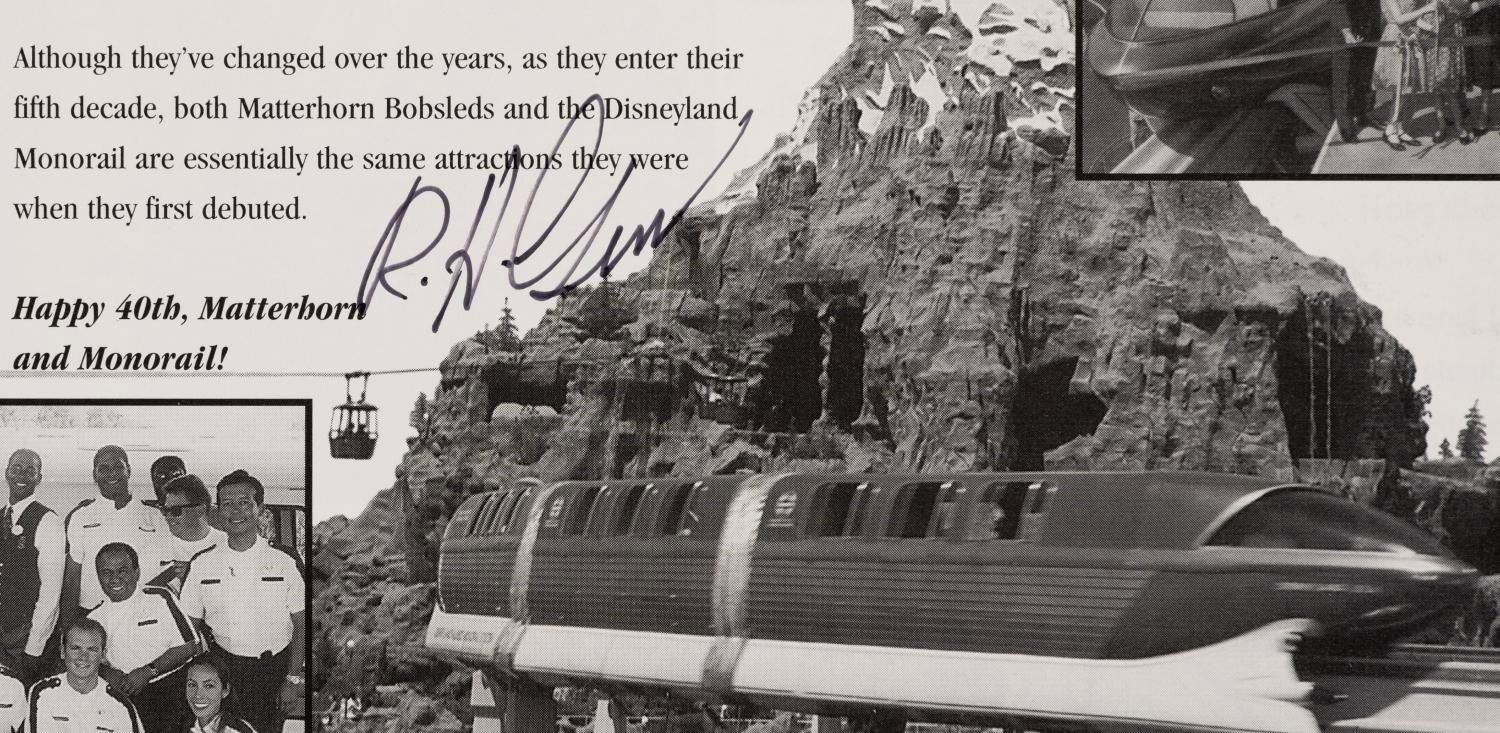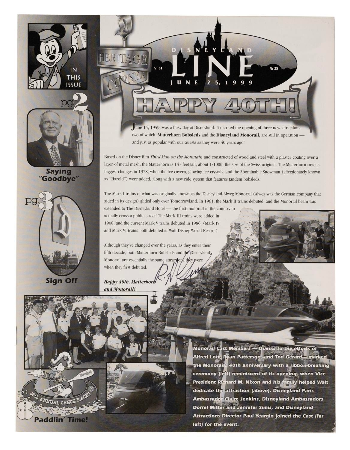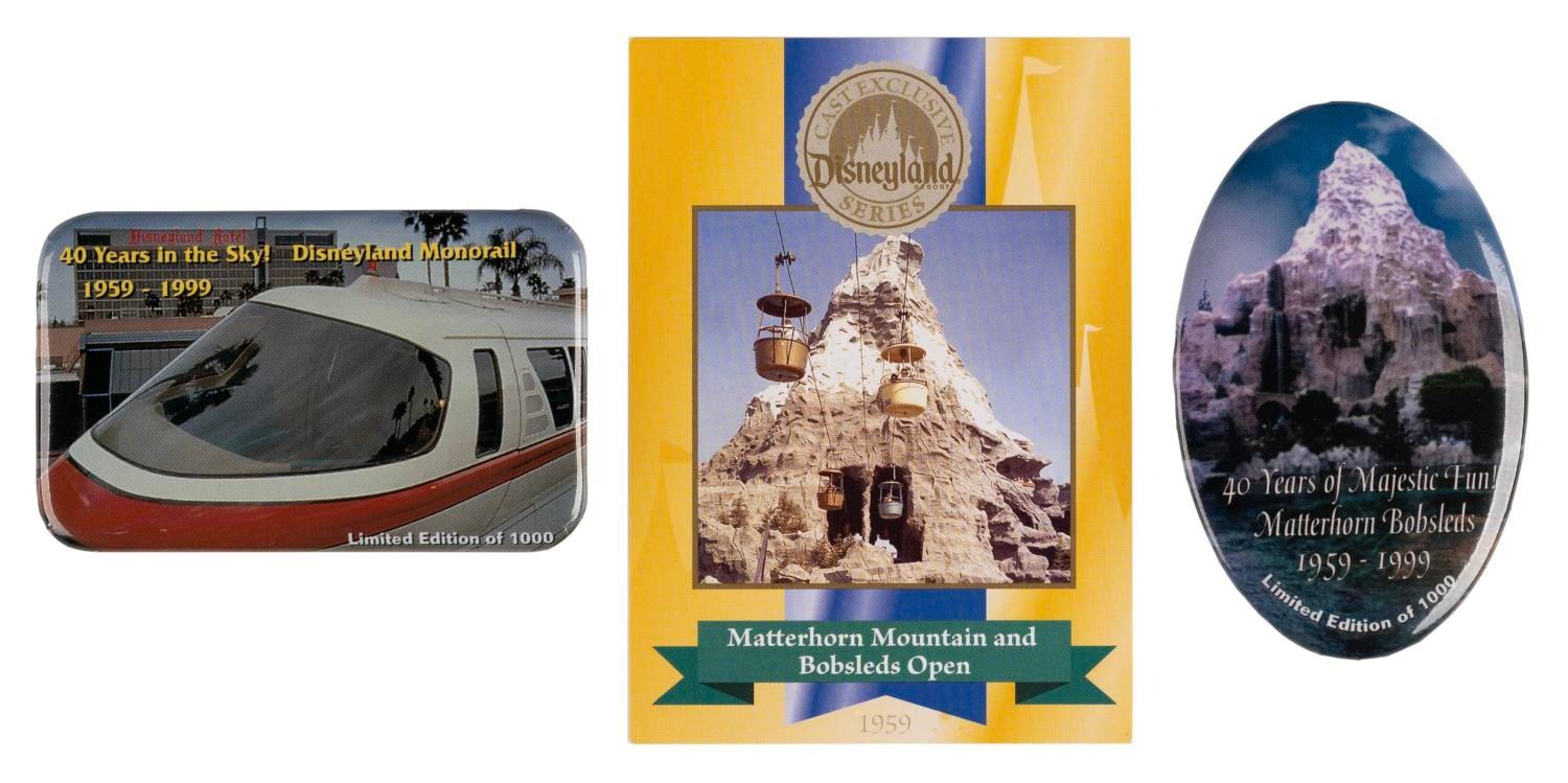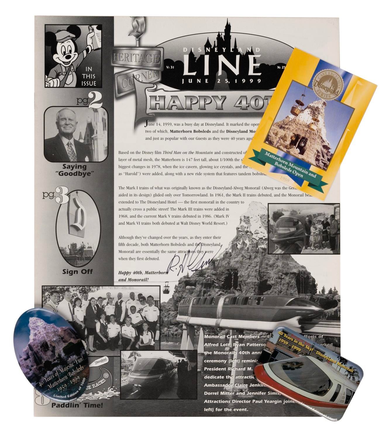 (Disneyland, 1999) A June 1999 copy of "Disneyland Line" magazine featuring the 40th anniversary of the Matterhorn, hand-signed by Imagineer Bob Gurr. Also included are a pair of 40th anniversary Matterhorn and Monorail pinback buttons, and a Matterhorn trading card. Measuring from 2.75" x 1.75" to 8.5" x 11", the items are in fine condition with light scratching to the Monorail pin from use.