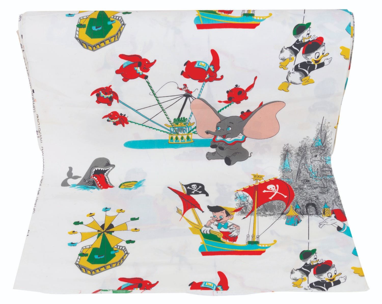 (Disney, 1970s-80s) A rare bolt of Fantasyland-themed fabric including Pinocchio, Dumbo, Peter Pan, Tinker Bell, Donald, and his nephews enjoying the land's attractions. Measuring approximately 15 yards in length and 39” in width, the fabric is in very good to fine condition with light stains and fraying at the edges.