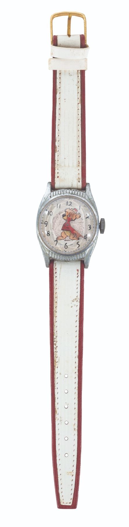 (US Time, 1948) A Bongo the Bear Birthday Series wristwatch, manufactured by US Time under the Ingersoll name. The watch features Bongo the Bear on the face and was released for Mickey’s 20th birthday in 1948. The timepiece has been tested for function, and although it does work, it requires servicing to run properly. Measuring 9” long with a 1.25” case, the watch displays in good overall condition, exhibiting scuffs, wear, and aging to the genuine leather bands and metal. The watch comes with the original instructions and a fair-to-good condition commemorative box, with mild color fading and tears to two edges of the lid, scuffs, and scratches throughout. Est. $60 - $80