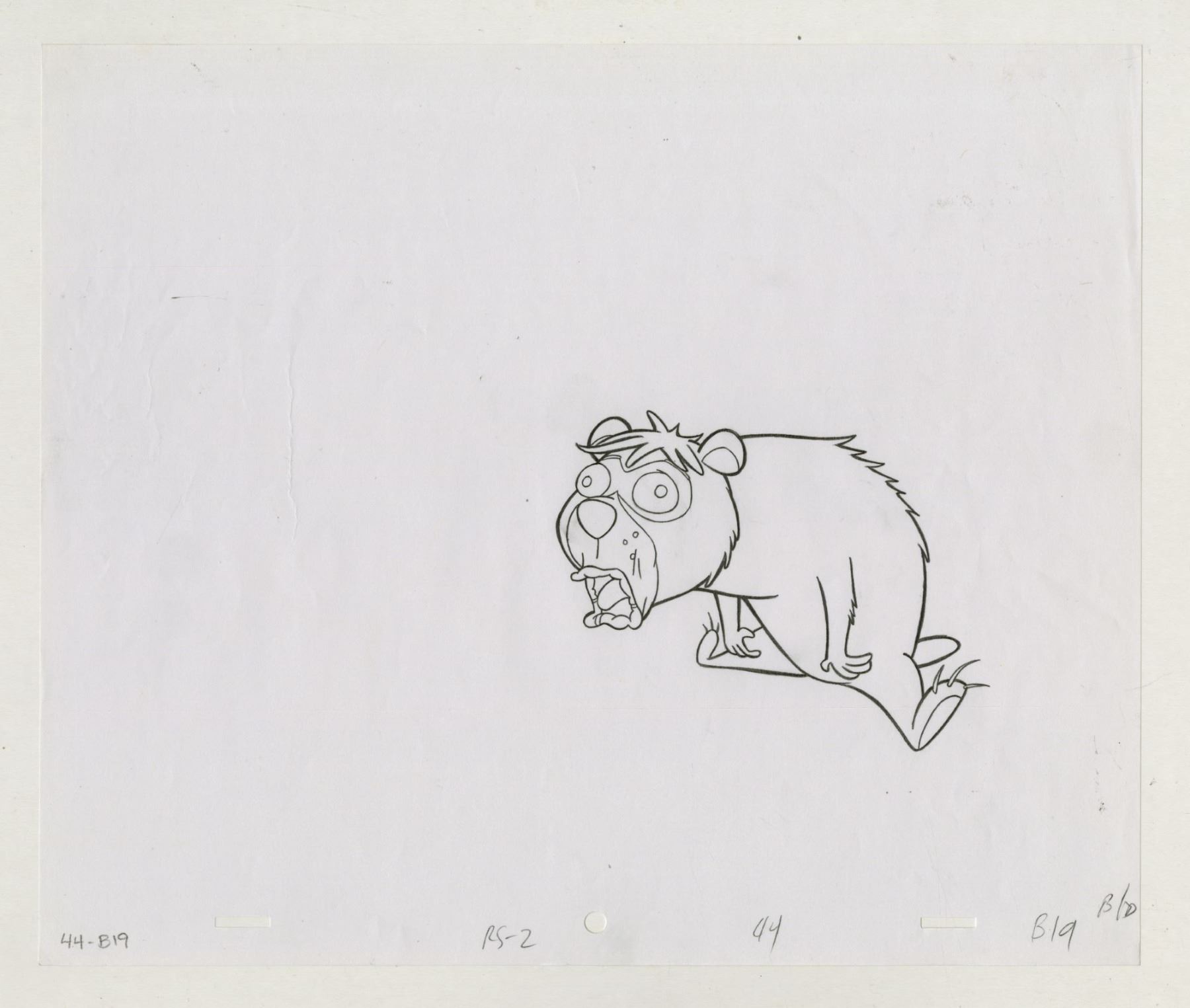 (Cartoon Network, 1999) An original production drawing of Boo Boo from the SPUMCO Studios Yogi Bear parody short “Boo Boo Runs Wild.” With a character image size of 4” x 4.75” on 10.5” x 12.5” animation paper, the graphite drawing is in very good condition with minor wrinkling to the left side.