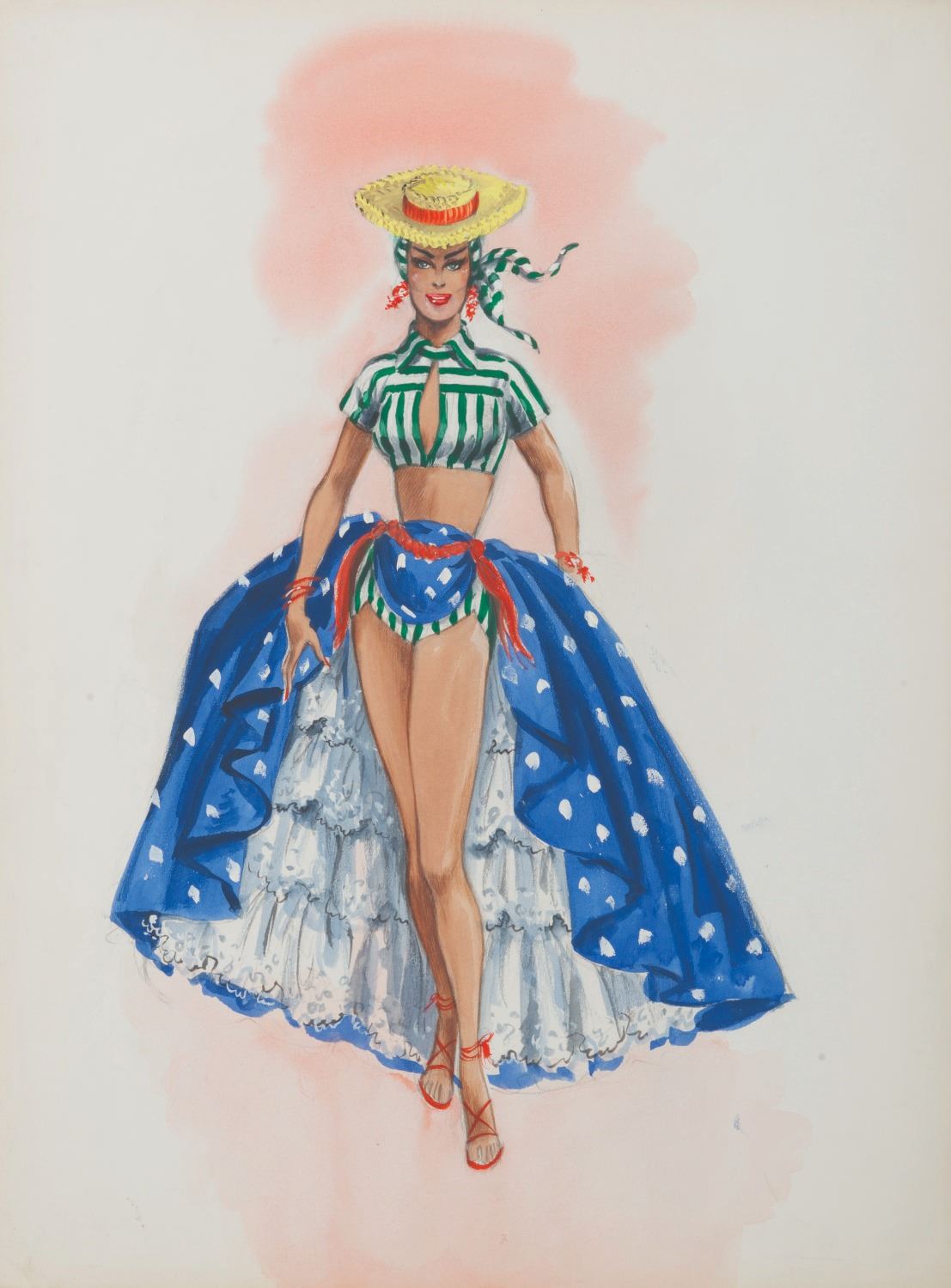 (United Artists, 1957) A costume concept for the film"Bop Girl Goes Calypso." The blue dancer design was executed in gouache and pencil on artist board by Costume Designer Paula Giokaris. Measuring 15"x20", the concept art is in good production-used condition, with light edge wear, scuffs, and small original pigment smudges in the border areas.