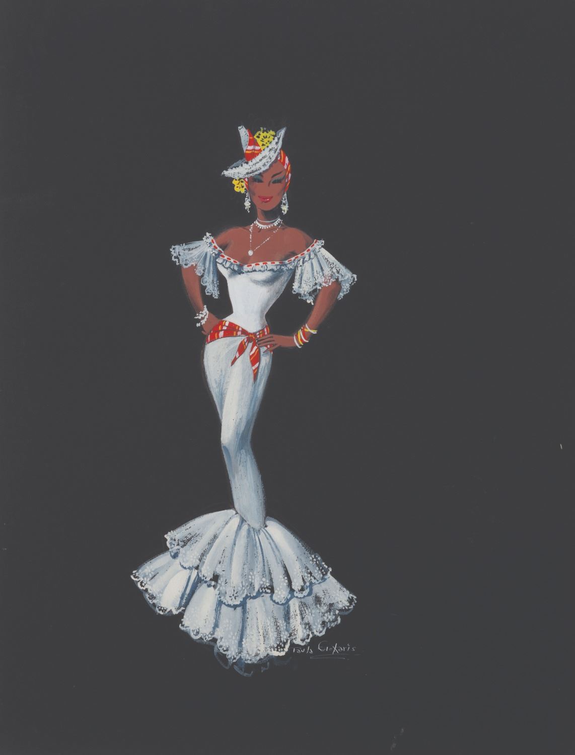 (United Artists, 1957) A costume concept for the film"Bop Girl Goes Calypso." The design was executed in gouache and pencil by Costume Designer Paula Giokaris. Measuring 15"x20", the concept art is in good production-used condition, with light edge wear, scuffs, and small original pigment smudges in the border areas.