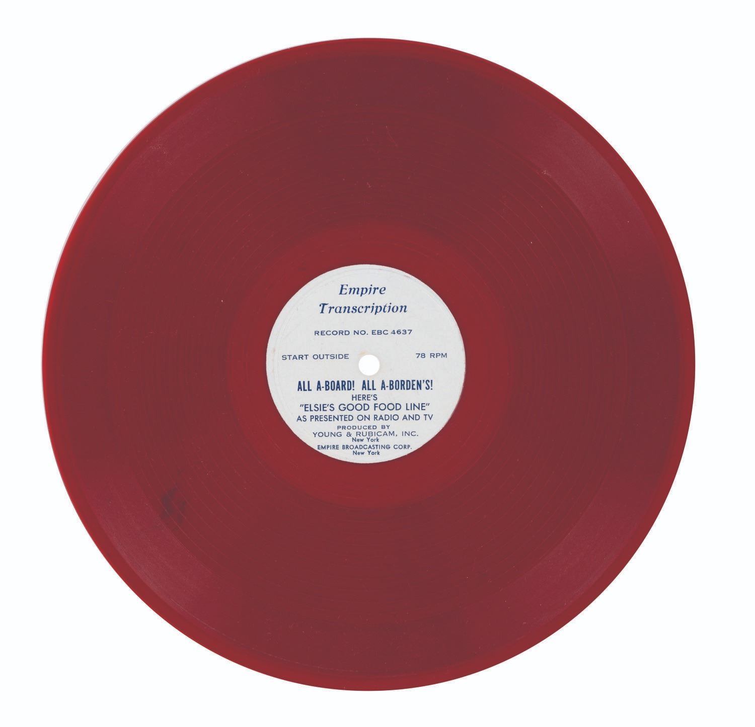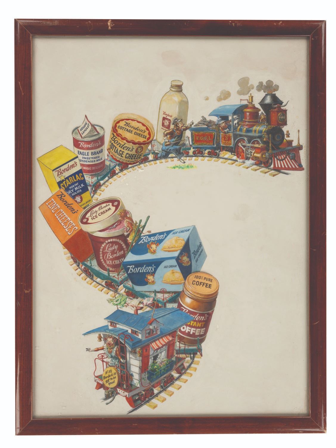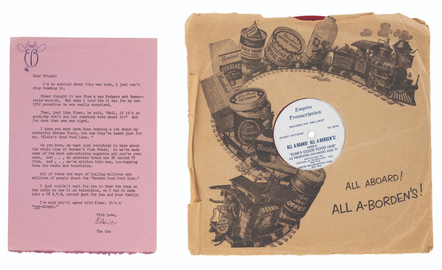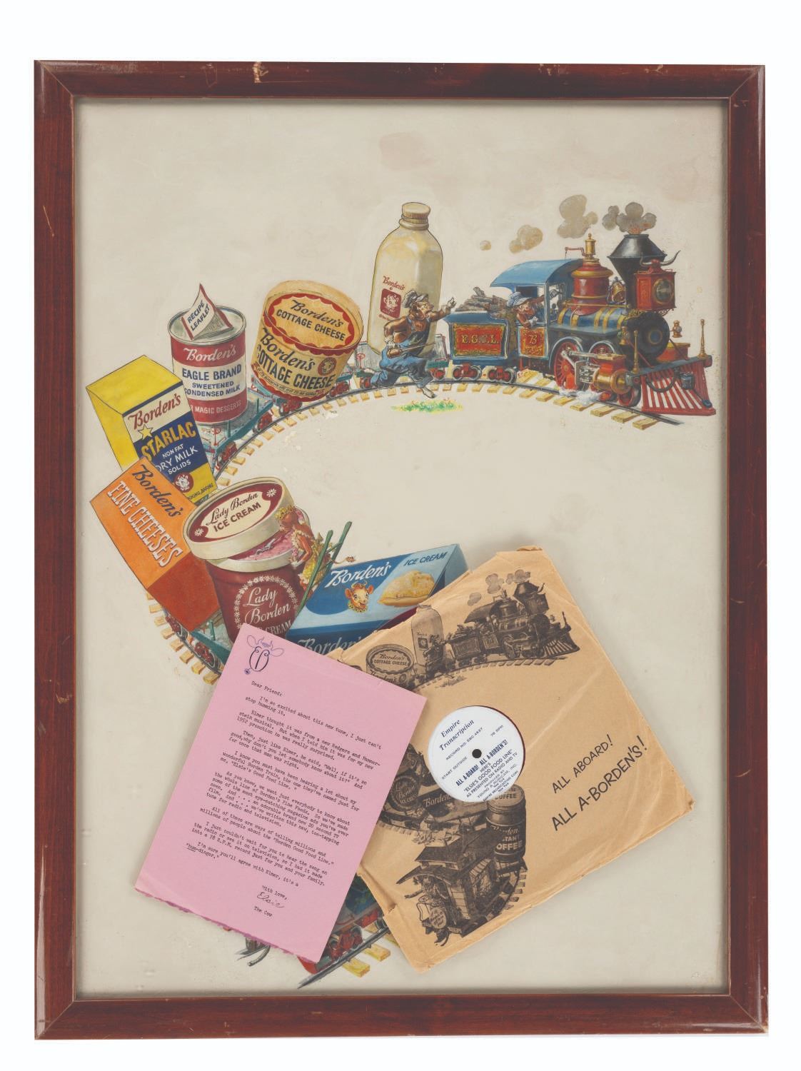 (Borden, 1950s) A Borden's "Elsie's Good Food Line" advert art, and record of the advert song "Elsie's Good Food Line.” The artwork was accomplished in gouache, measuring 20.5" x 28", and is in good condition, with some light flaking from age throughout that doesn't affect the image. The 78 rpm record plays very well, is 9.75" in diameter, and is in fine condition.