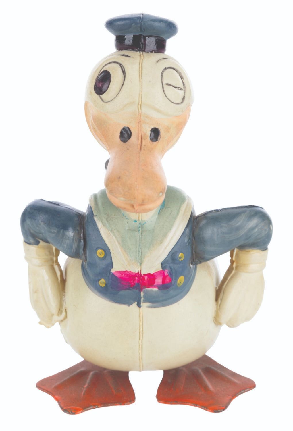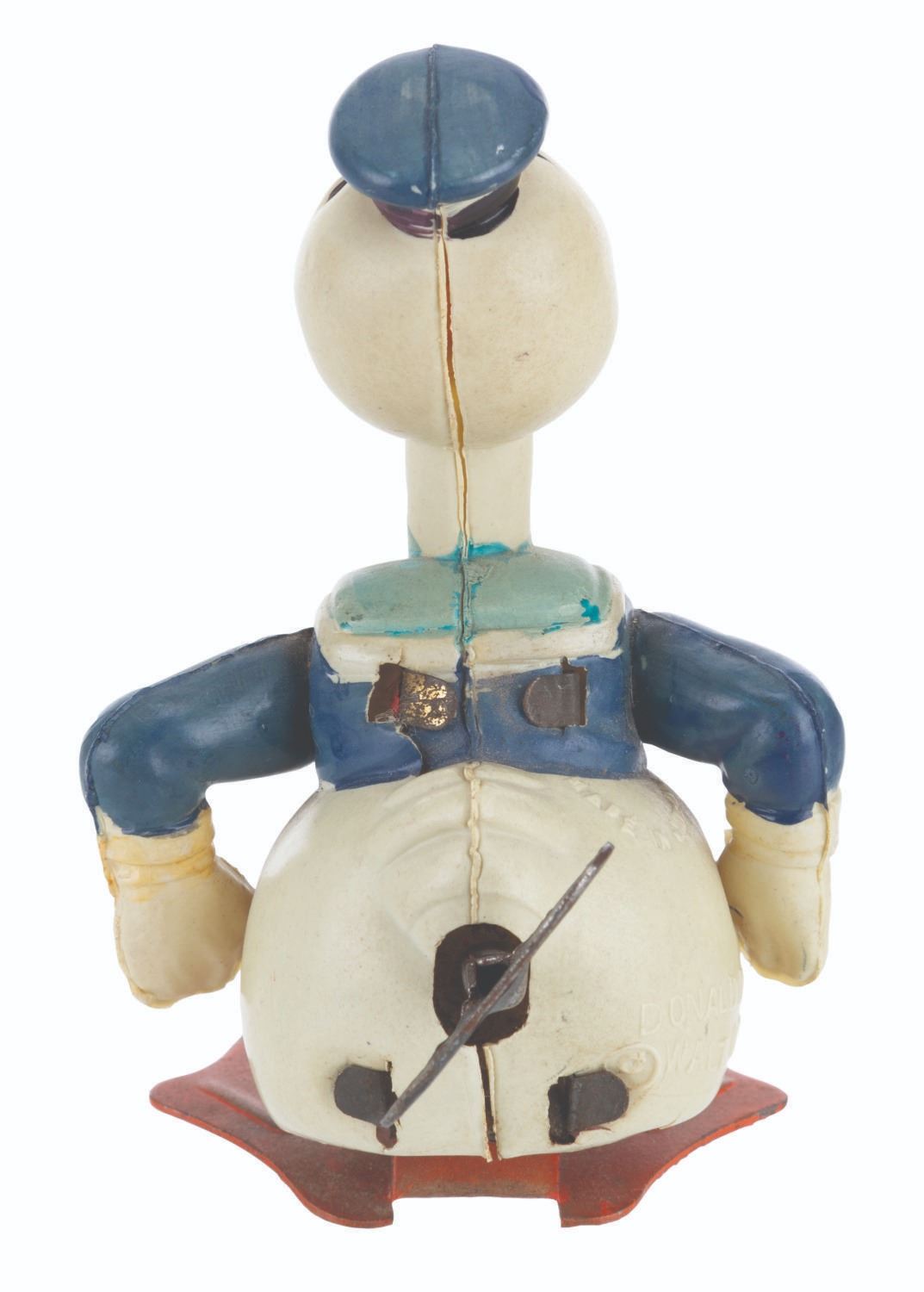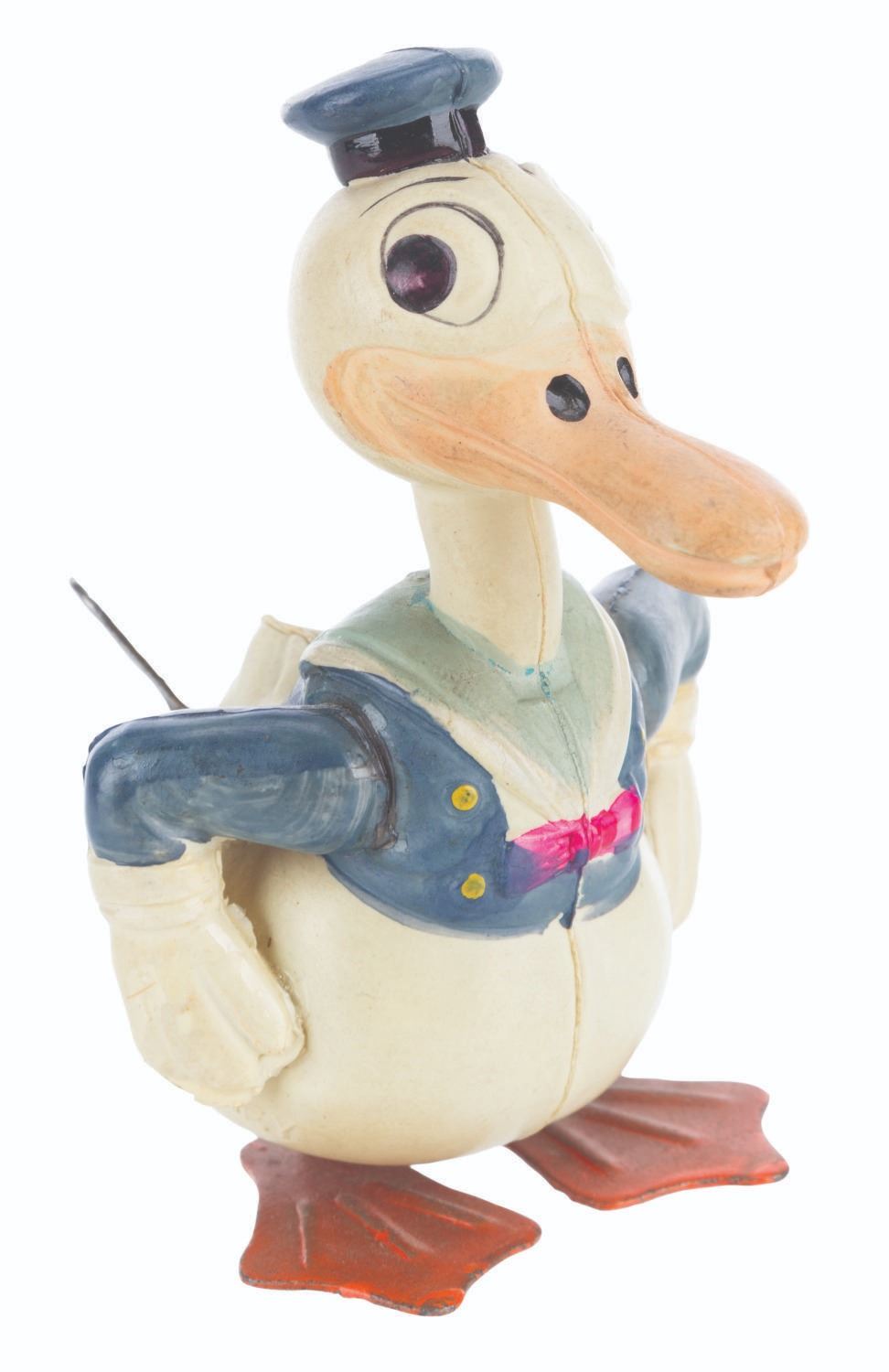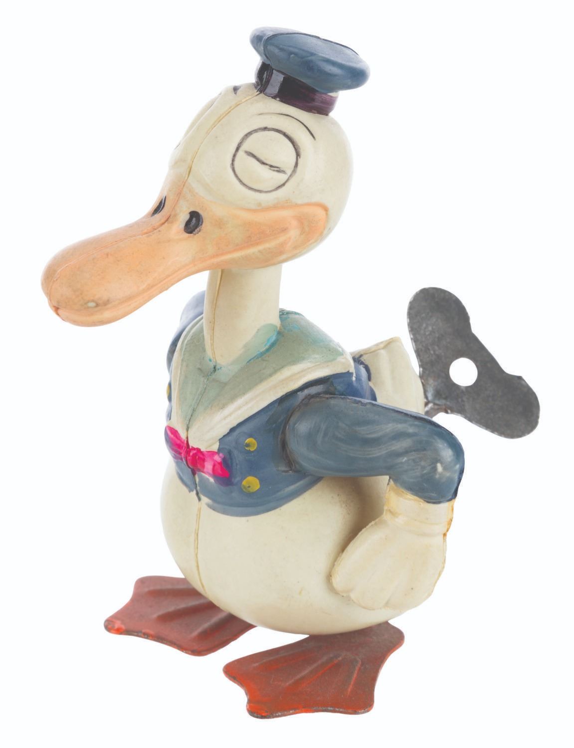 (Borgfeldt, 1930s) A wind-up toy of a winking Donald Duck manufactured by the George Borgfeldt Company. When wound with the included key, Donald is intended to waddle forward. The toy worked intermittently when tested. Measuring 3.5” tall, the toy displays in very good condition with paint loss, discoloration from age, light oxidation on the feet, and wear.