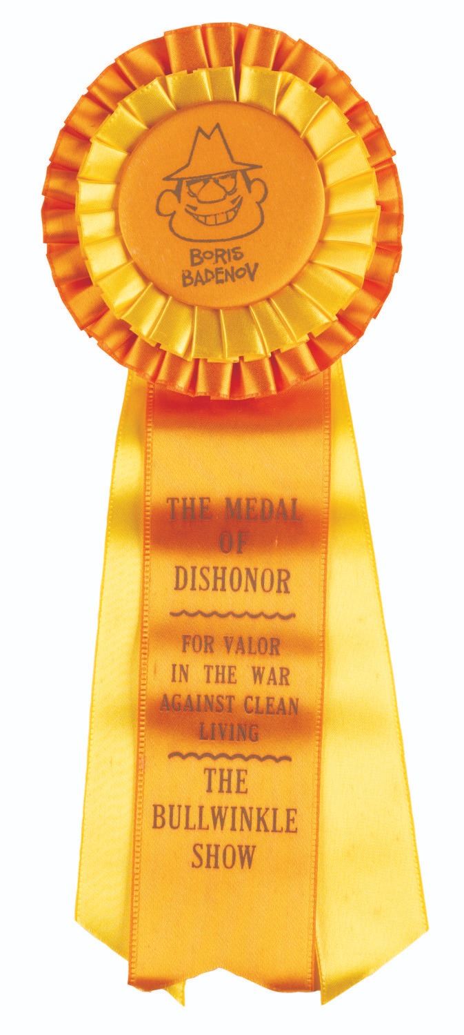 (Ward, 1962) A Boris Badenov “The Medal of Dishonor” ribbon gifted to VIPs as part of Jay Ward’s Operation Loudmouth promotion of “The Bullwinkle Show.” Measuring 10” x 3.75”, the nylon ribbon is in fine condition, presented in a 10.5” x 4” x 1.5” Jay Ward Productions box in good condition with wear and scuffs.