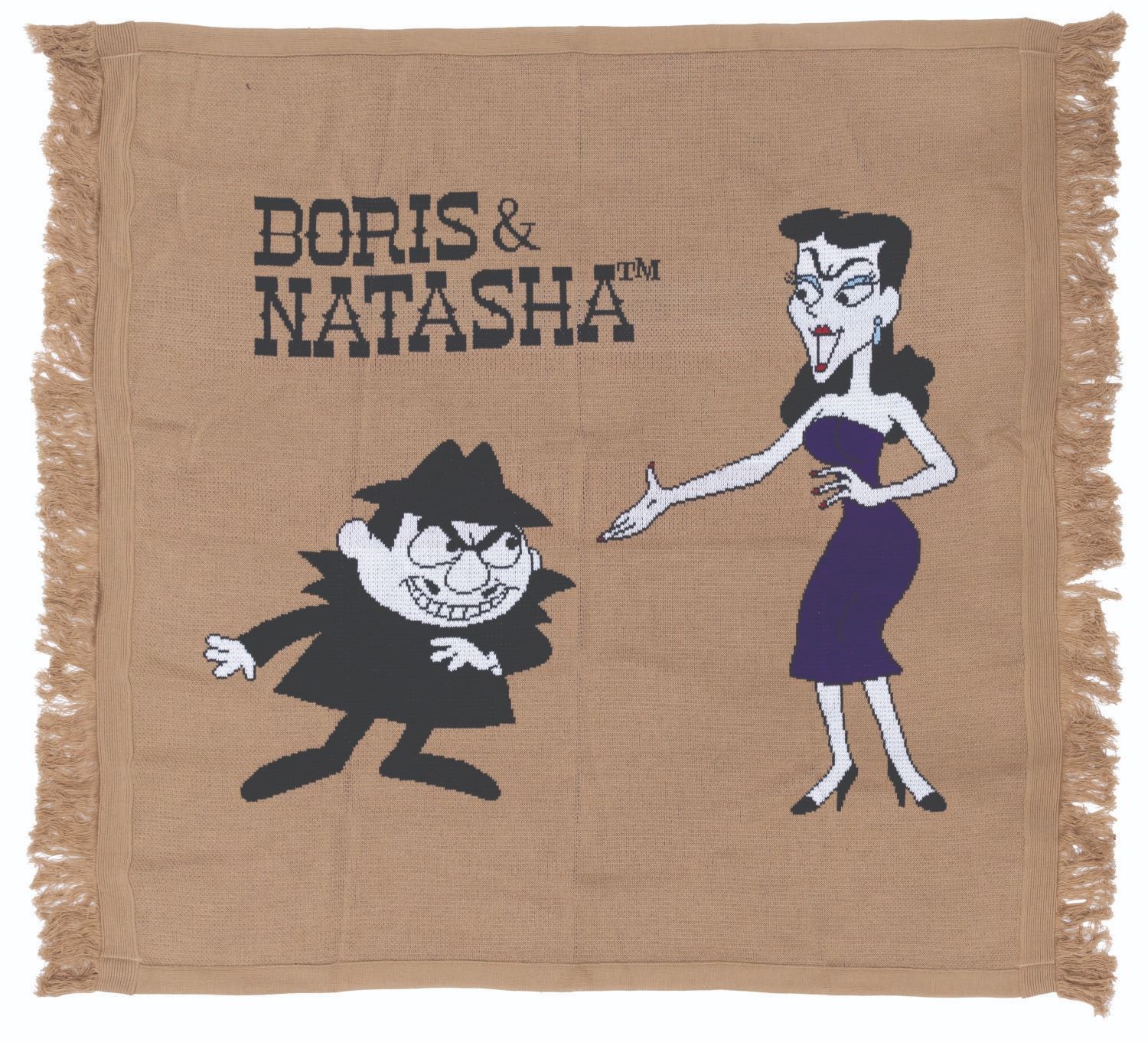 (Brackney Hills Knitting, 2006) A large heavy-knit Boris and Natasha blanket, with loops at each corner for easy display. Measuring 62” x 68”, the blanket is in very good condition with a single loose loop above Natasha’s arm.
