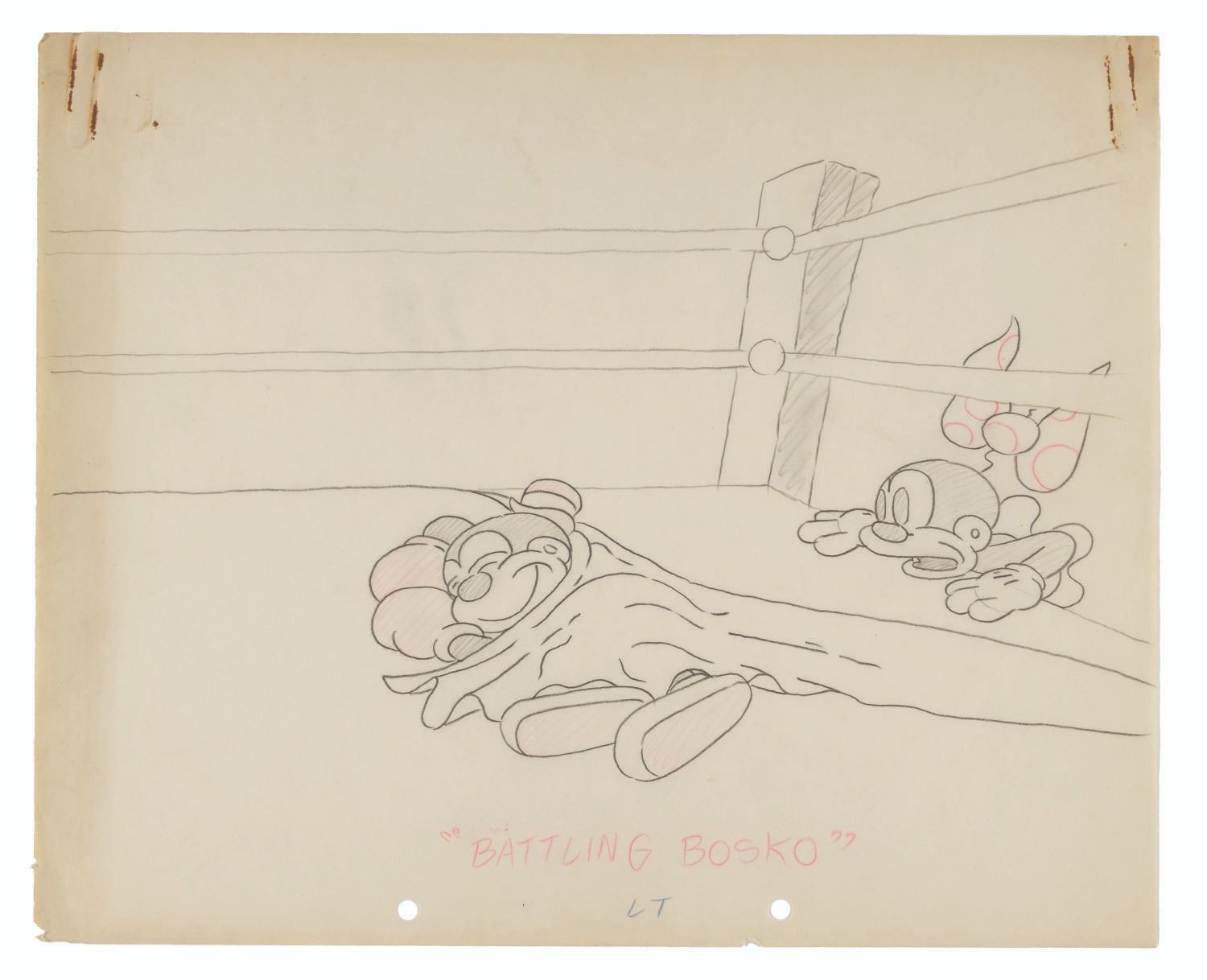 (Harman-Ising, 1932) An original storyboard drawing of Bosko and Honey from the Looney Tunes short “Battling Bosko.” Accomplished in graphite and colored pencil, the drawing measures 9.75” x 12” and is in good condition with light creasing and edge wear from production use, two small rips along the lower left and bottom edge, each measuring less than 0.25”, a paperclip oxidization stain to the upper left corner, and light discoloration from age.