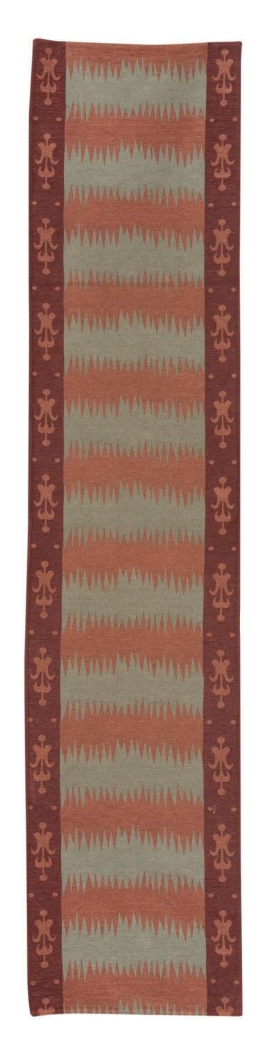 (Walt Disney World) A bed runner from a suite of the Boulder Ridge at The Villas at Disney's Wilderness Lodge. The runner is green with brown zig-zags within a burgundy border, and is in good condition with minor wear from Resort-use.
