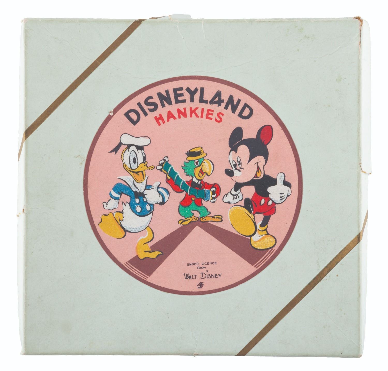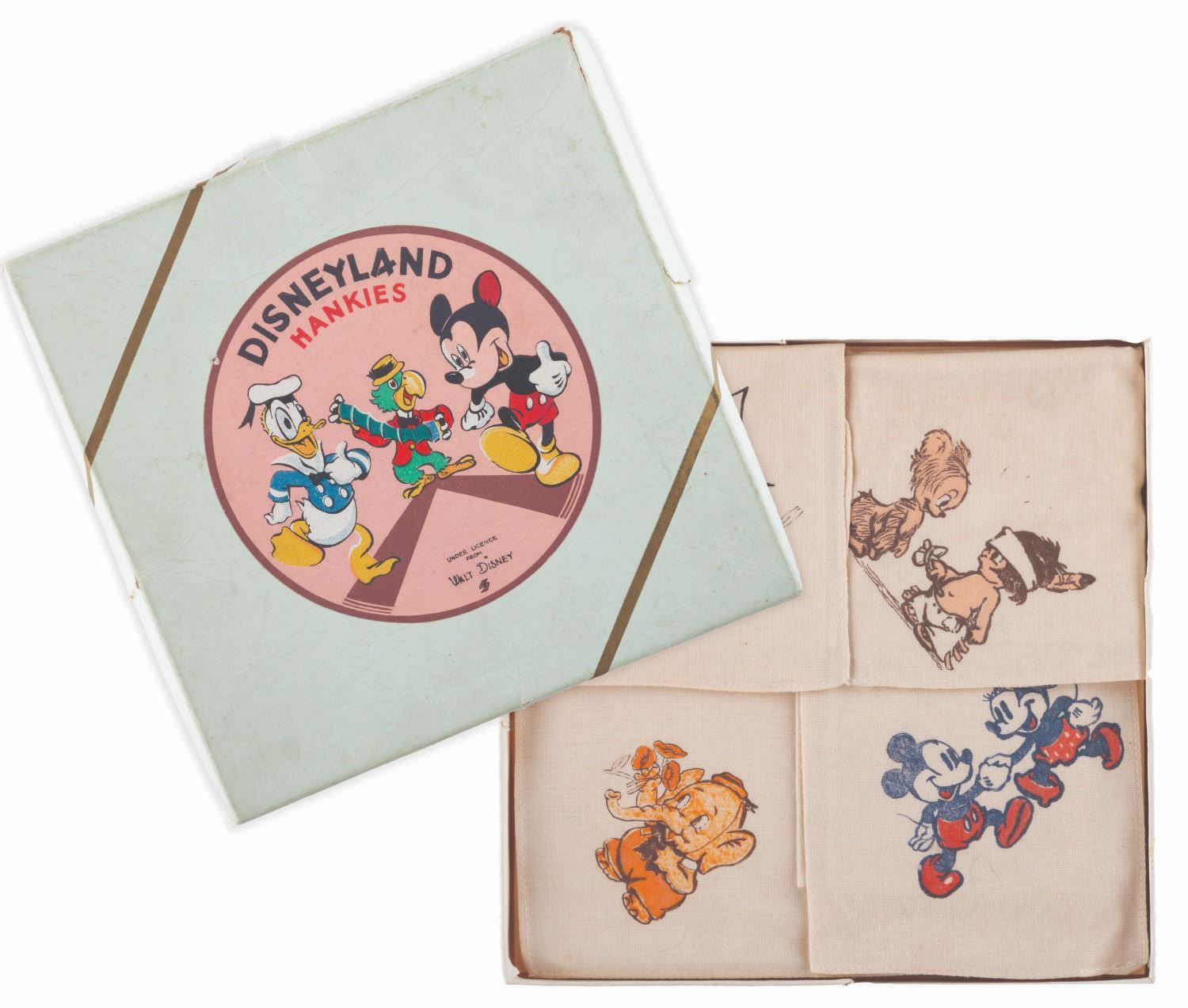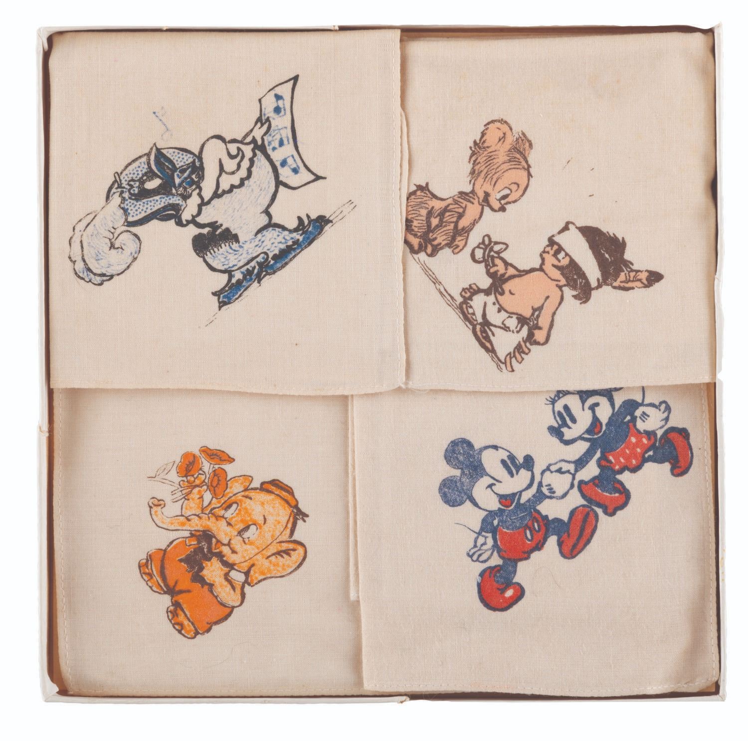 (Disney, 1940s) A boxed set of four “Disneyland" hankerchiefs with images of Little Hiawatha, Elmer the Elephant, Mickey & Minnie, and Clara Cluck. The name “Disneyland" was sometimes used on products well before the Park opened. The handkerchiefs are in very good condition with wear from age only, in their 6" x 6" good condition box with creases and split corners.
