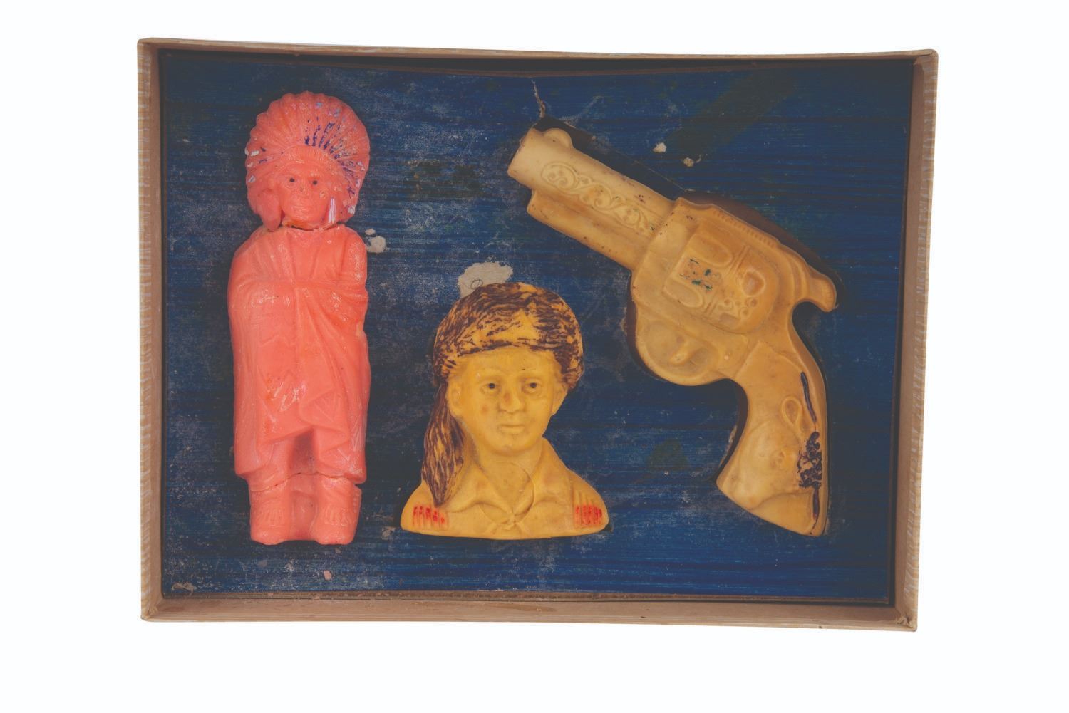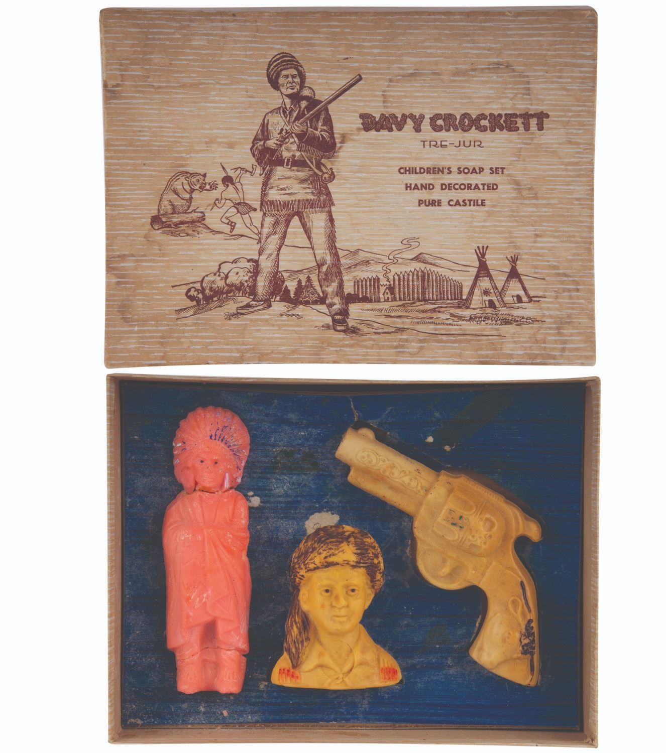 (Tre-Jur, 1950s) A boxed set of three Davy Crockett-themed perfumed soaps. Shaped like a bust of Crockett, a pistol, and an Indian Chief, the set comes in its 9.5" x 7" original box. The soap is in fair condition, with some loss to coloring, a press to Crockett's nose, slight cracking from age on the surface of the pistol, and the Chief's head separated from the body. The box is in very good condition, with light staining.