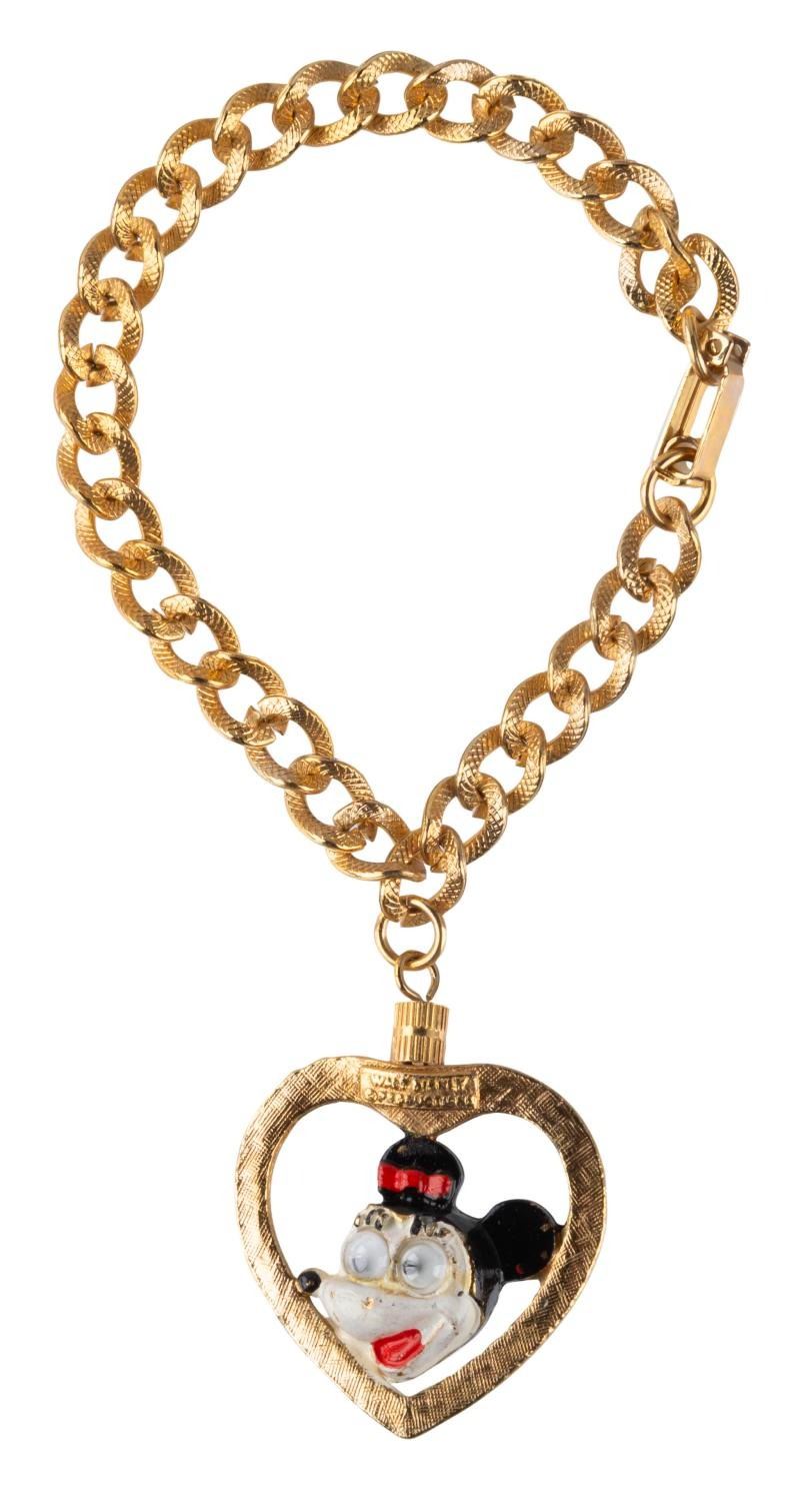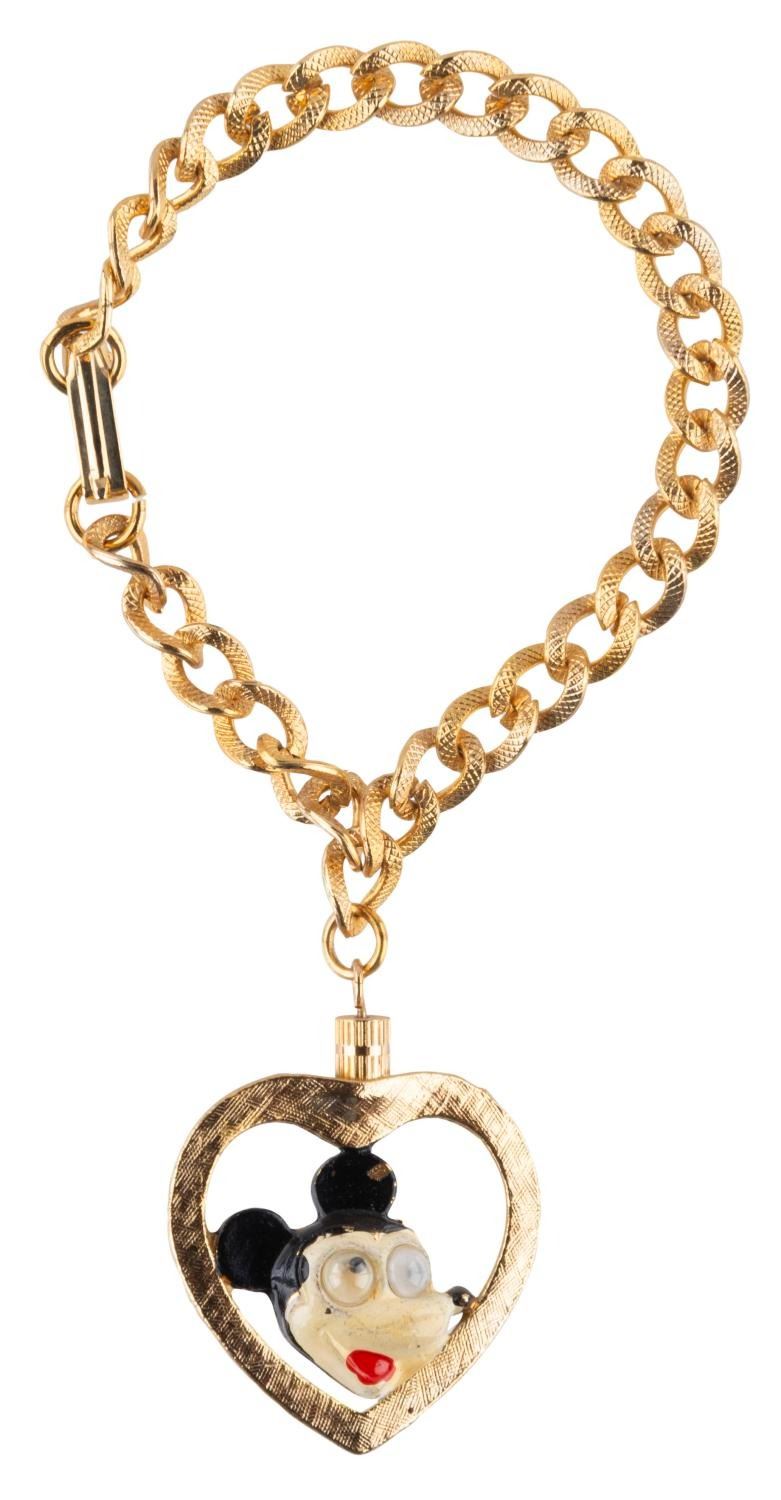 (Disney, 1960s) A gold-toned bracelet with a reversible charm featuring Mickey on one side and Minnie on the other. Measuring 1.25” x 1.25” and 6.75” in length, the charm and bracelet are in very good condition with wear from age and light paint chipping on both sides of the charm.