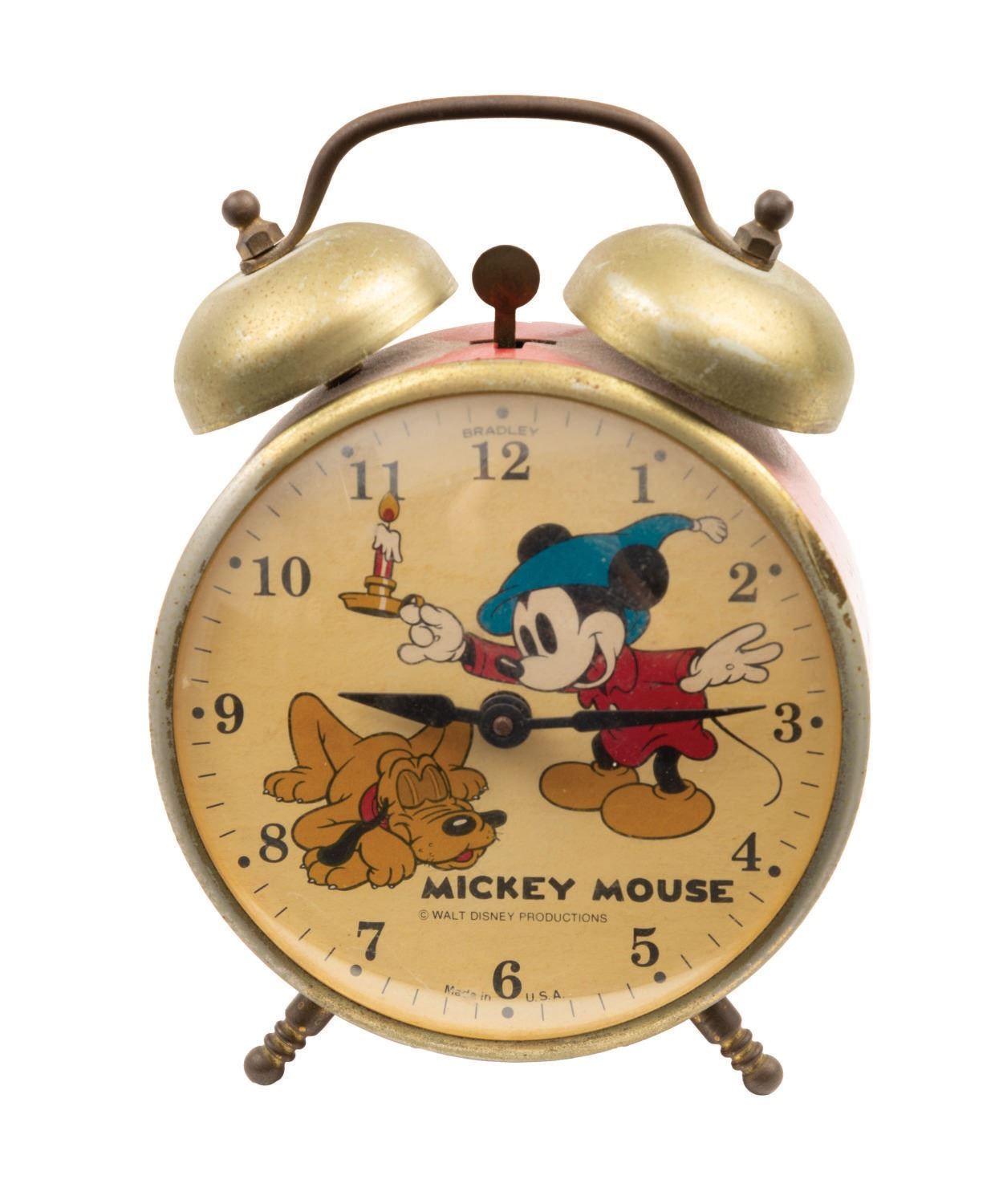 (Bradley, 1970s) A wind-up alarm clock featuring Mickey Mouse and Pluto, produced by Bradley in the 1970s. Measuring approximately 6"x4.5", the clock is In good condition, with some edge wear to finish on front edge, and spotting to the bells. The clock needs repair to function properly.
