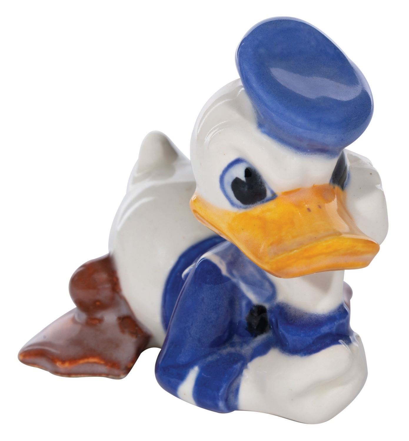 (Brayton Laguna, 1930s) A ceramic figurine of Donald Duck produced by Brayton Laguna in the late 1930s. Brayton Laguna was the first pottery company licensed by Disney to produce ceramic figurines. They made very few Donald Duck figurines and this particular piece is quite scarce. Donald measures 4" long and 3.5" tall. He remains in fine condition with no cracks or crazing.