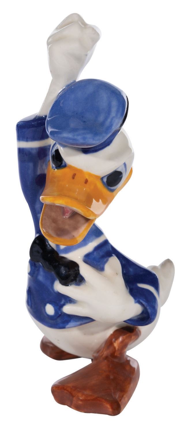 (Brayton Laguna 1940s) A rare and expressive Donald Duck ceramic figurine produced by Brayton Laguna Pottery. Brayton Laguna was one of the first California potteries and this is one of only a few Donald Duck figures they produced. Measuring 6.5" tall and 4" wide, the painted ceramic figure is in fine condition with light wear.