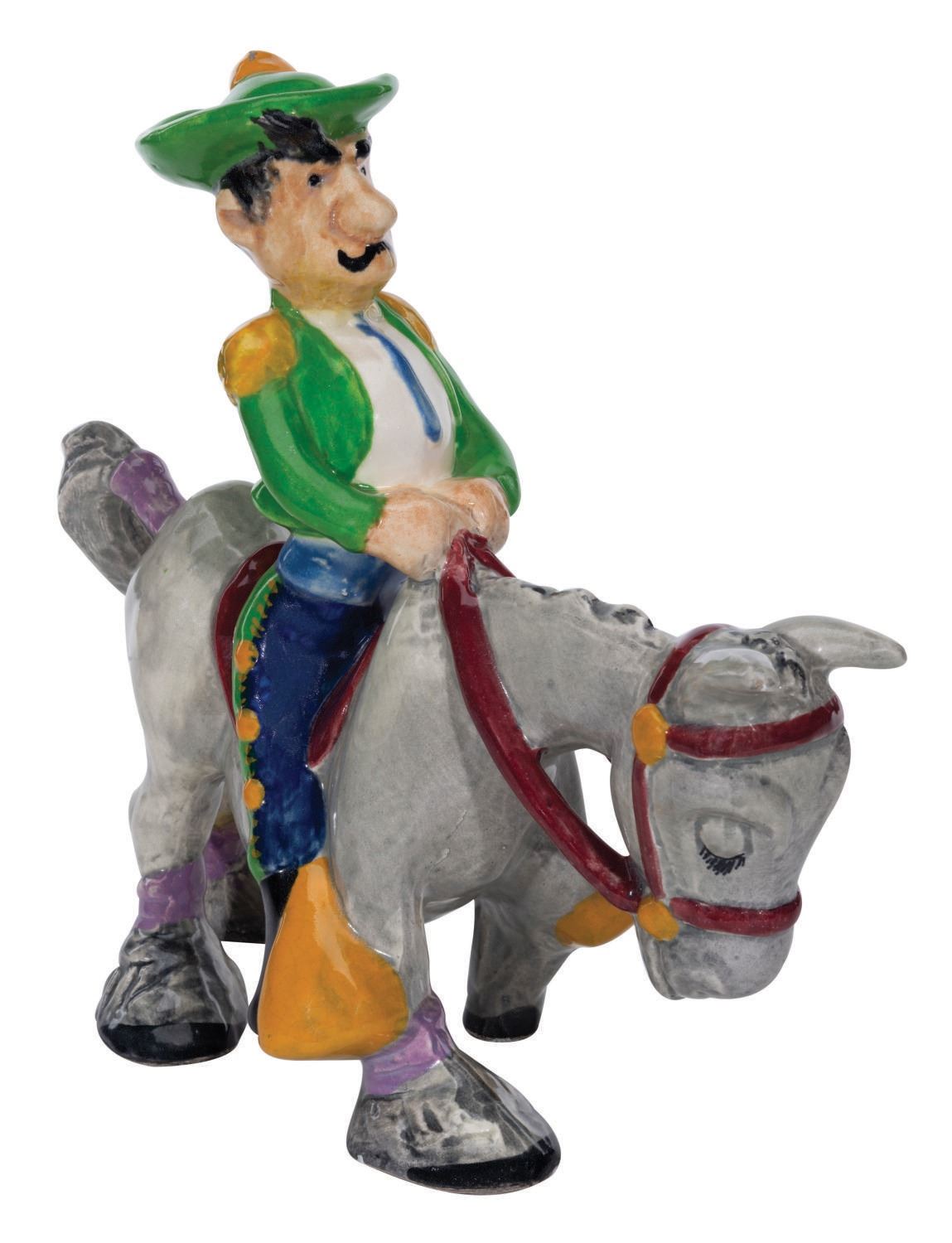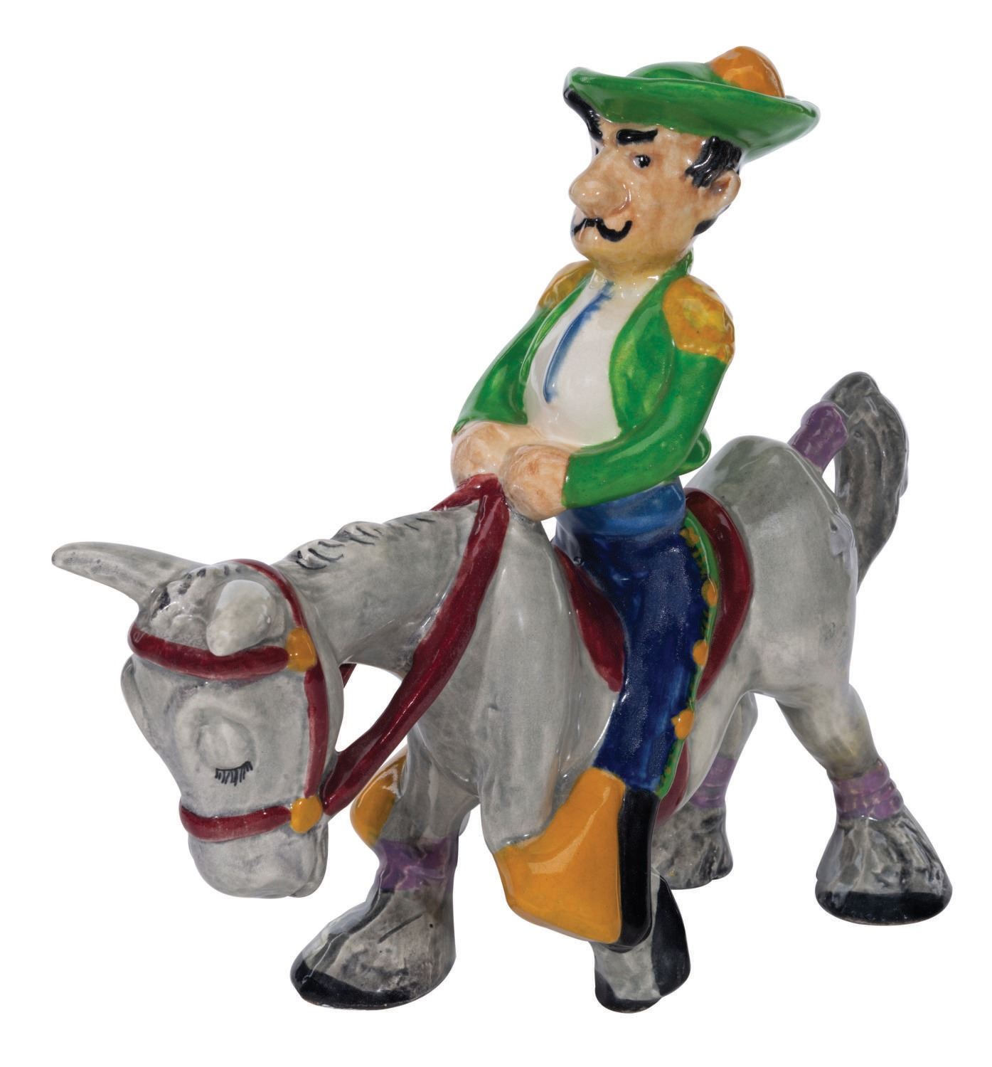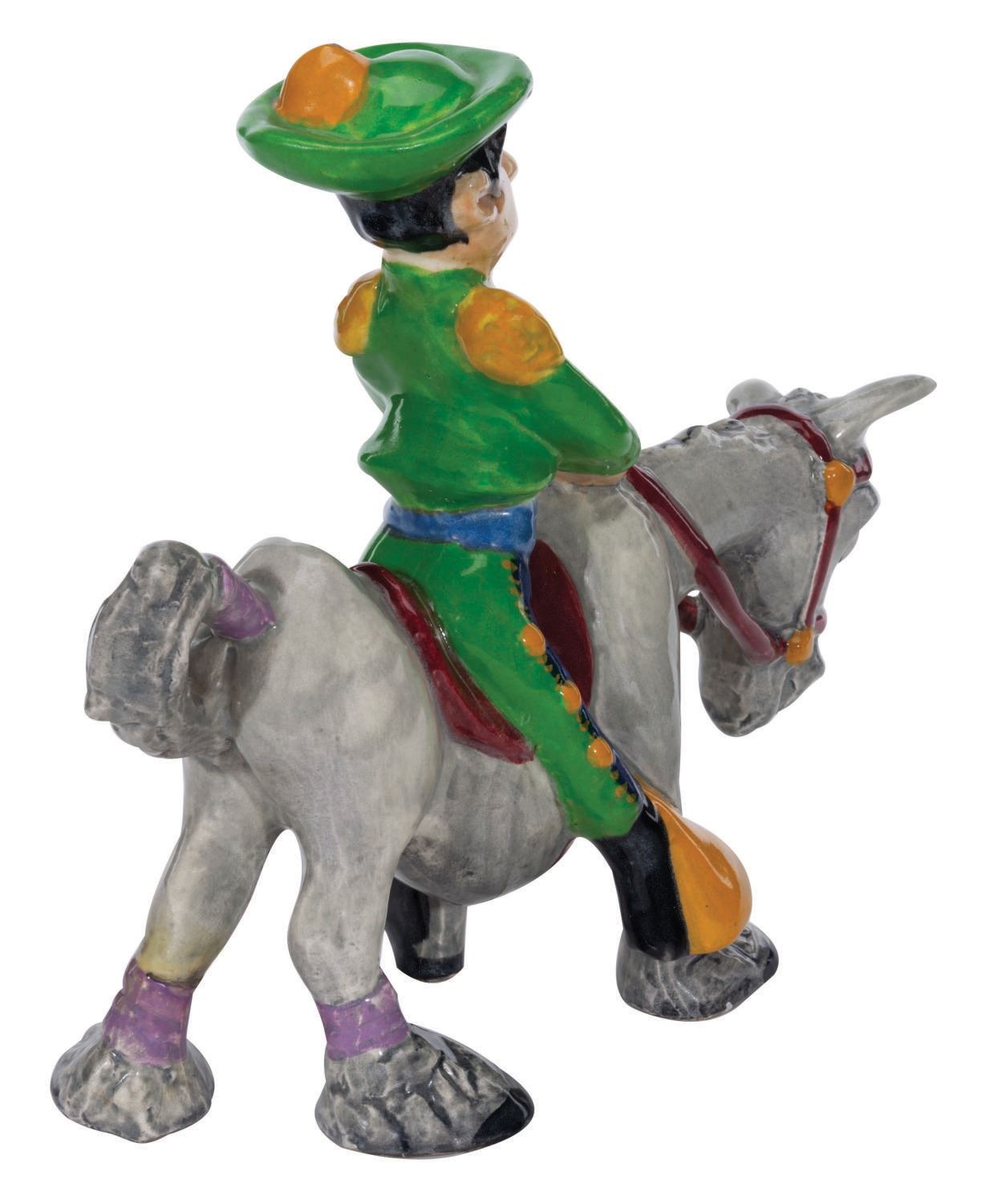 (Brayton-Laguna, 1938) A rare large painted glazed ceramic figurine of a toreador riding a swayback horse from Disney's "Ferdinand the Bull." Produced by Brayton Laguna Pottery in 1938, the figure is modeled after animator Bill Tytla. Measuring 5"x12"x11" high, this piece is in very fine condition, with spots of very fine crazing only visible on close inspection, and a .25" chip of paint missing from the very top of the hat's pom.