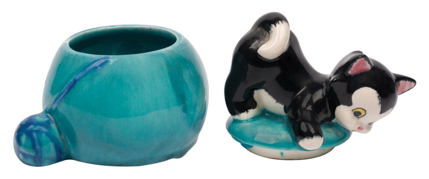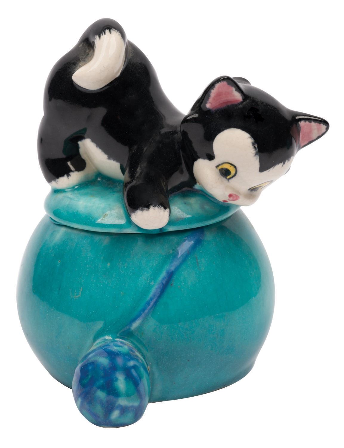 (Brayton Laguna, 1940) A beautiful glazed ceramic sugar bowl with Figaro lid. Produced by Brayton Laguna in 1940, the bowl stands 5.5" tall and is considered quite rare. The piece is in fine condition with Geppetto Pottery stamp on bottom.